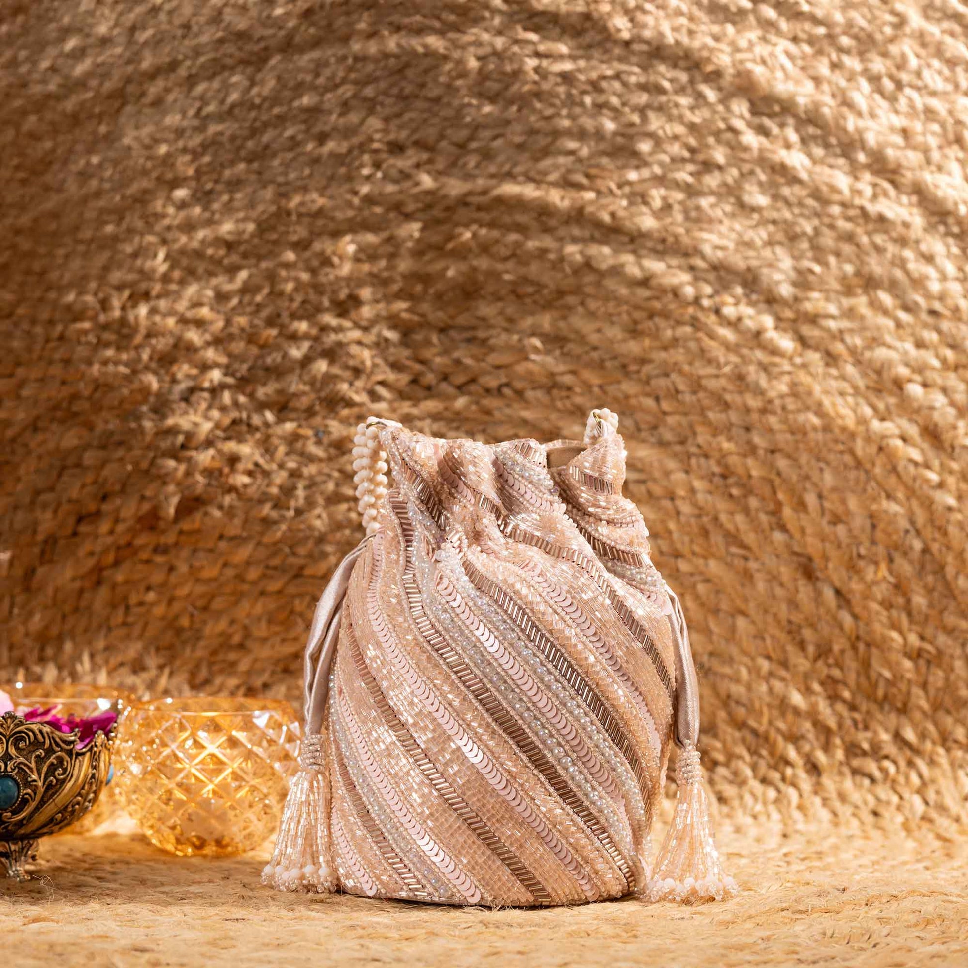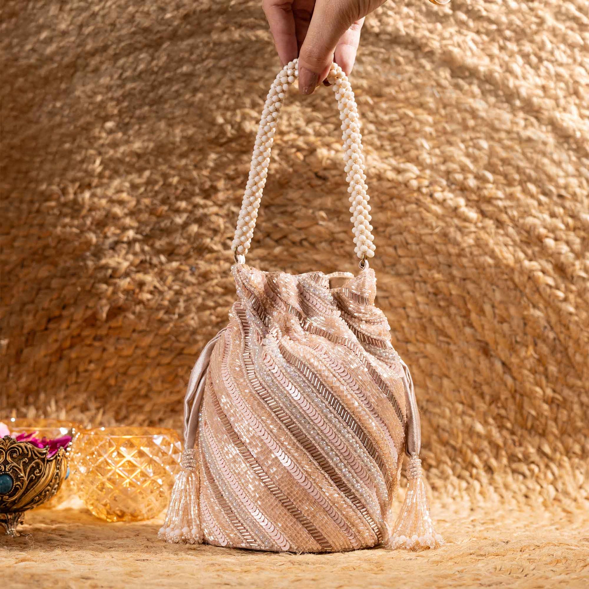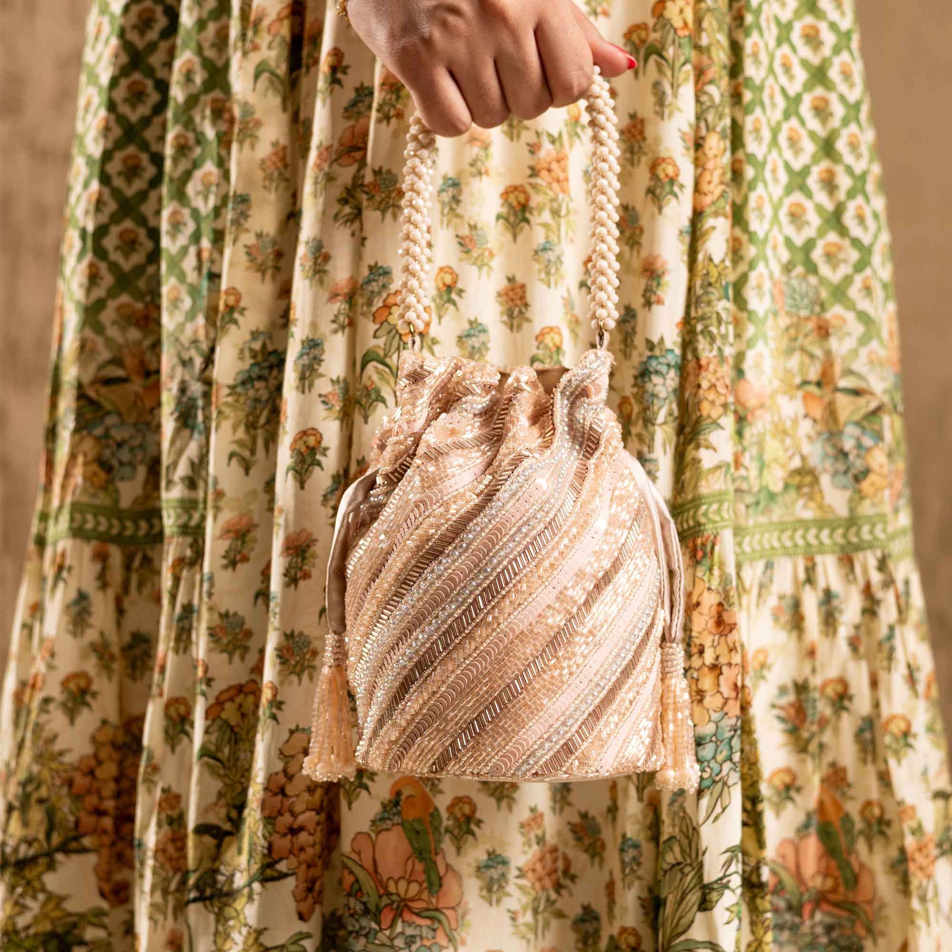 Elevate your festive style with SAANISH bucket potlis — where modern design meets timeless tradition. With their structured silhouette, roomy interiors, and hand-embellished detailing, these potlis strike the perfect balance between statement and sophistication. A must-have for weddings, soirées, and celebrations, they let you carry your essentials with grace and glamour.