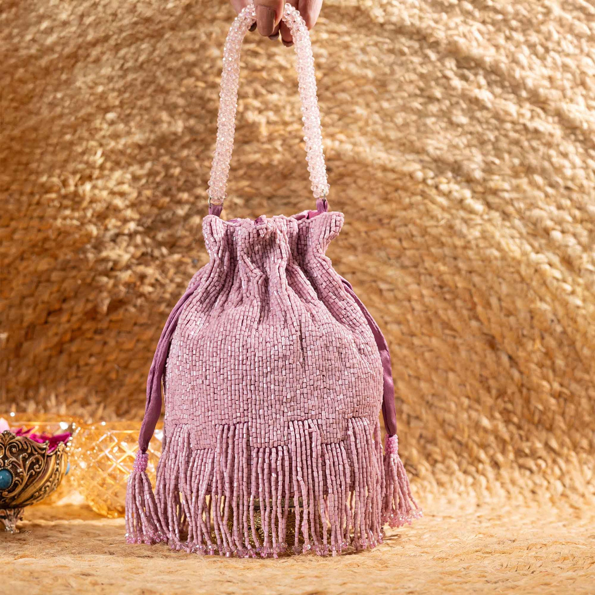 Elevate your festive style with SAANISH bucket potlis — where modern design meets timeless tradition. With their structured silhouette, roomy interiors, and hand-embellished detailing, these potlis strike the perfect balance between statement and sophistication. A must-have for weddings, soirées, and celebrations, they let you carry your essentials with grace and glamour.