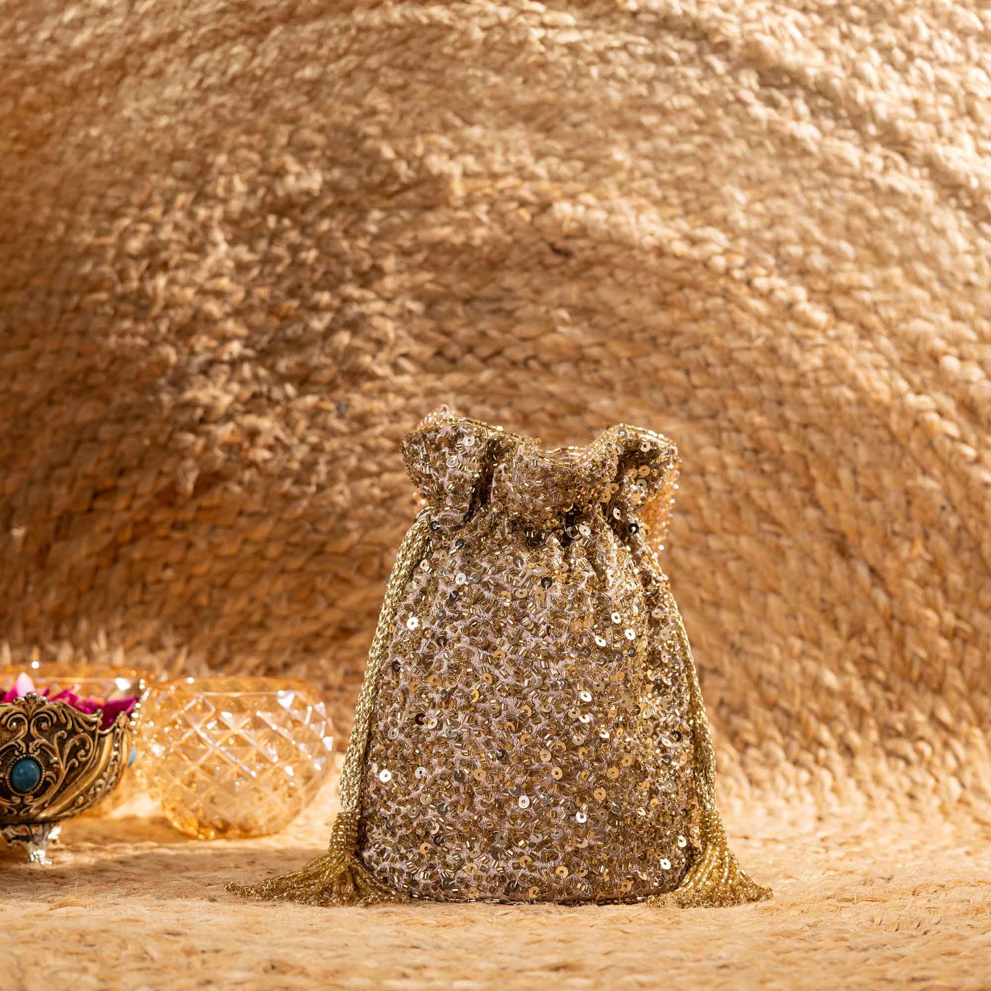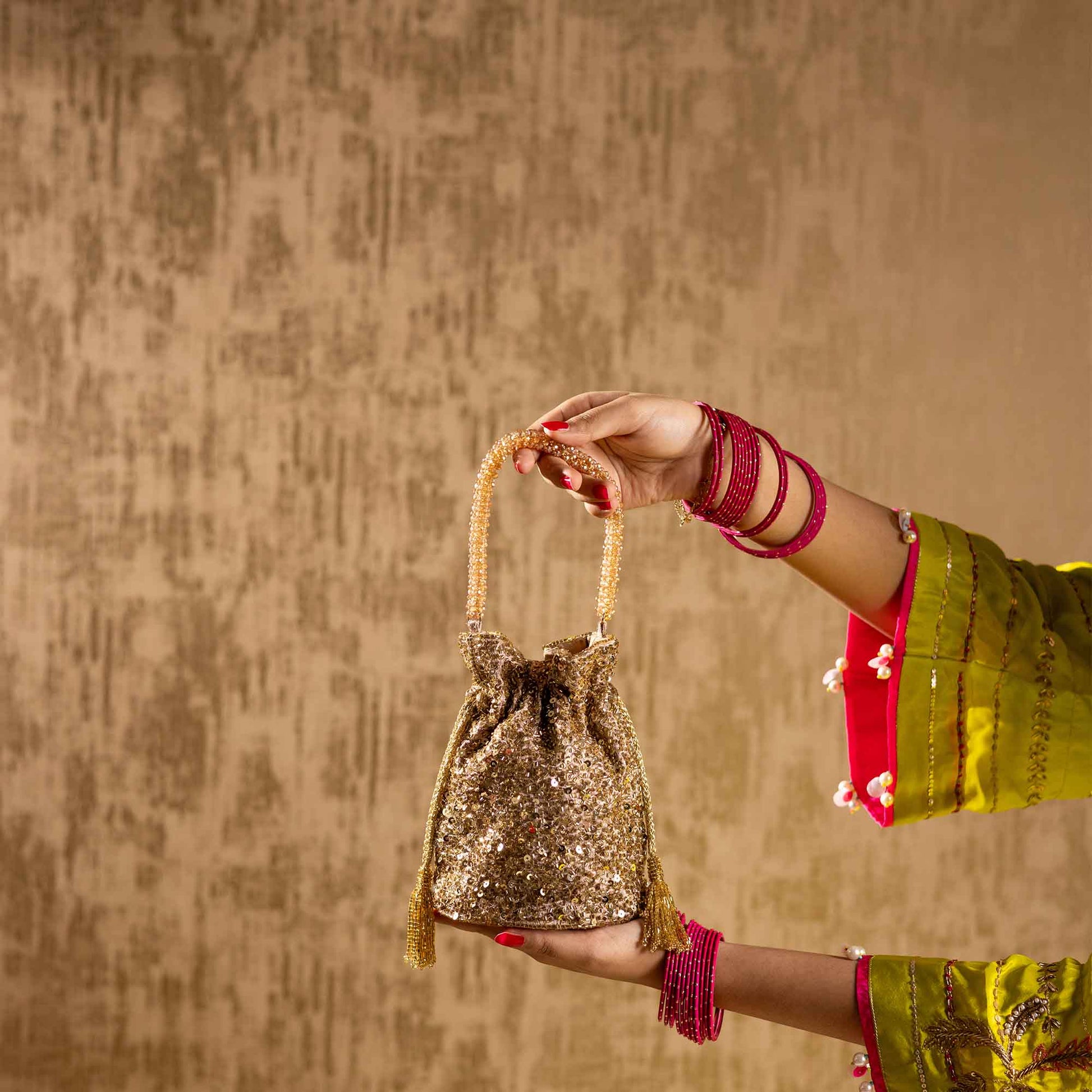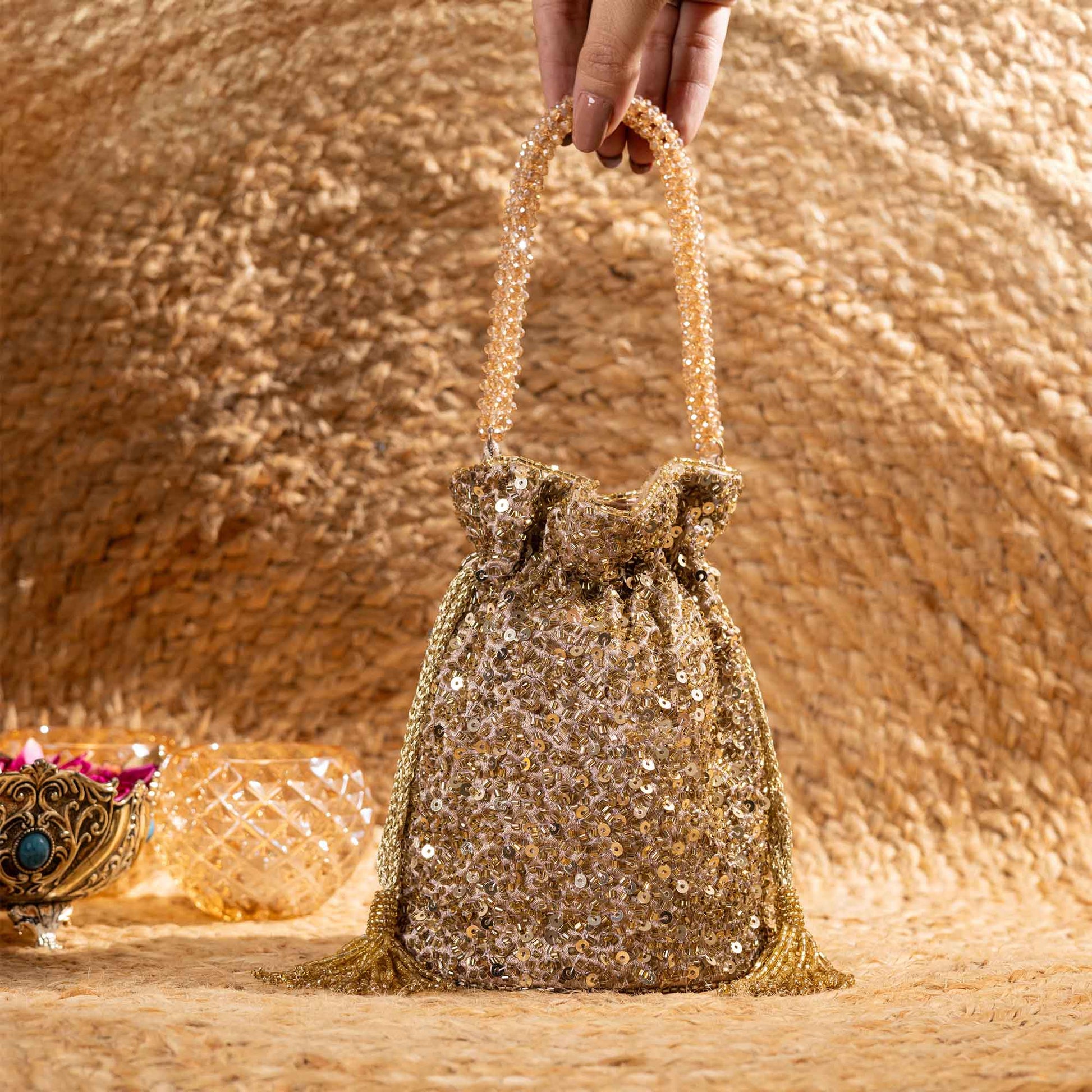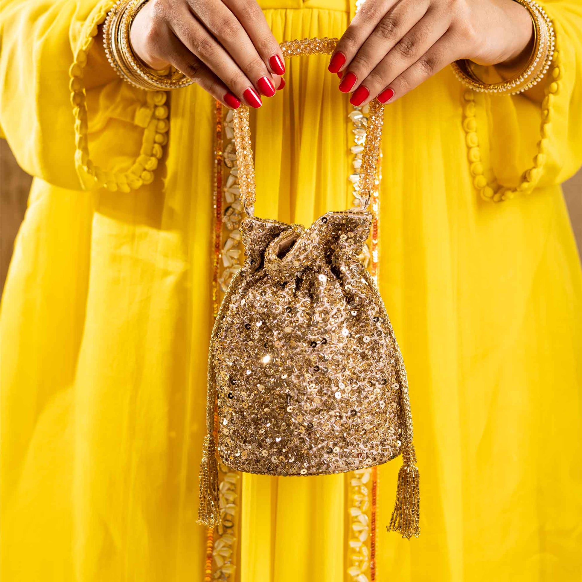 Elevate your festive style with SAANISH bucket potlis — where modern design meets timeless tradition. With their structured silhouette, roomy interiors, and hand-embellished detailing, these potlis strike the perfect balance between statement and sophistication. A must-have for weddings, soirées, and celebrations, they let you carry your essentials with grace and glamour.