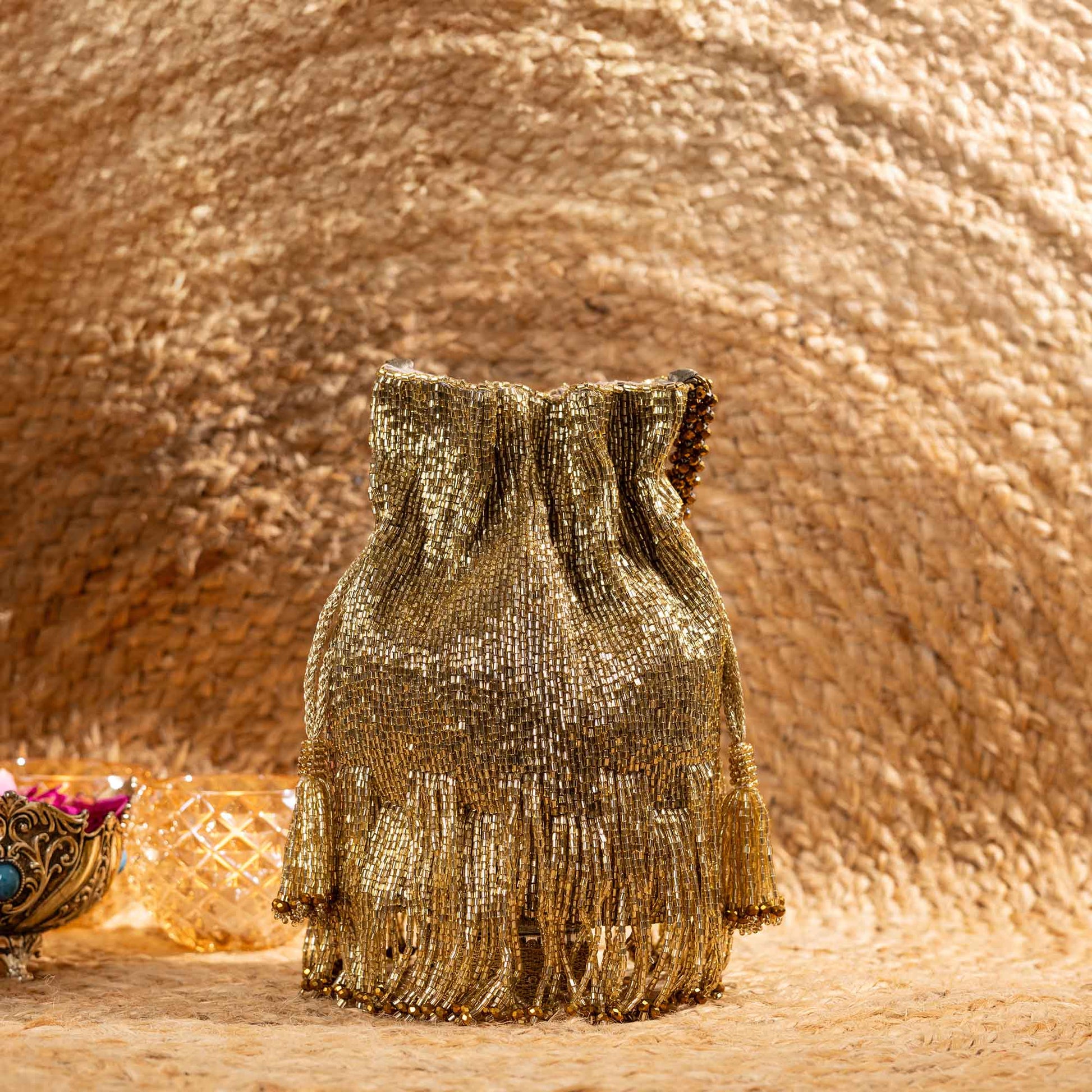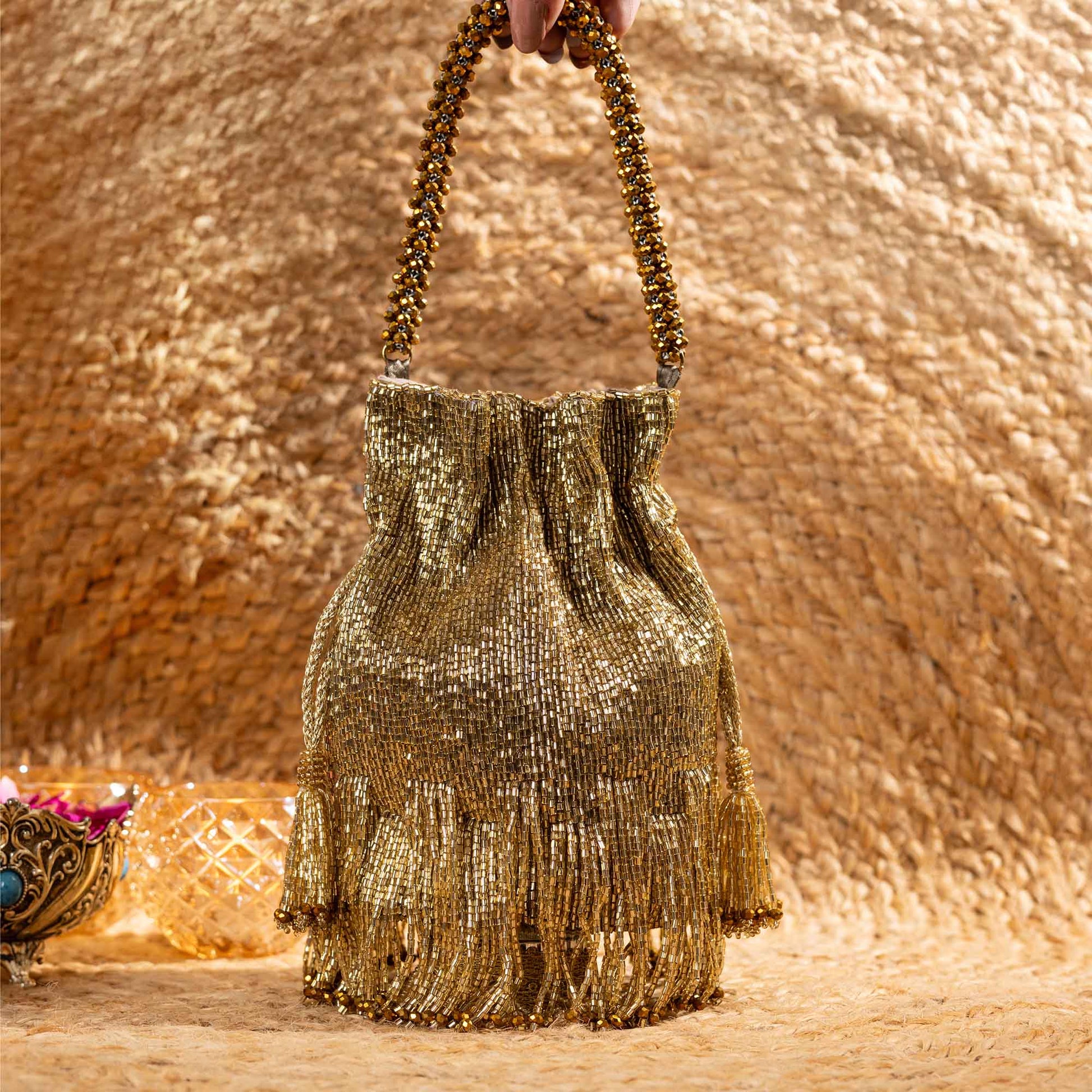 Elevate your festive style with SAANISH bucket potlis — where modern design meets timeless tradition. With their structured silhouette, roomy interiors, and hand-embellished detailing, these potlis strike the perfect balance between statement and sophistication. A must-have for weddings, soirées, and celebrations, they let you carry your essentials with grace and glamour.