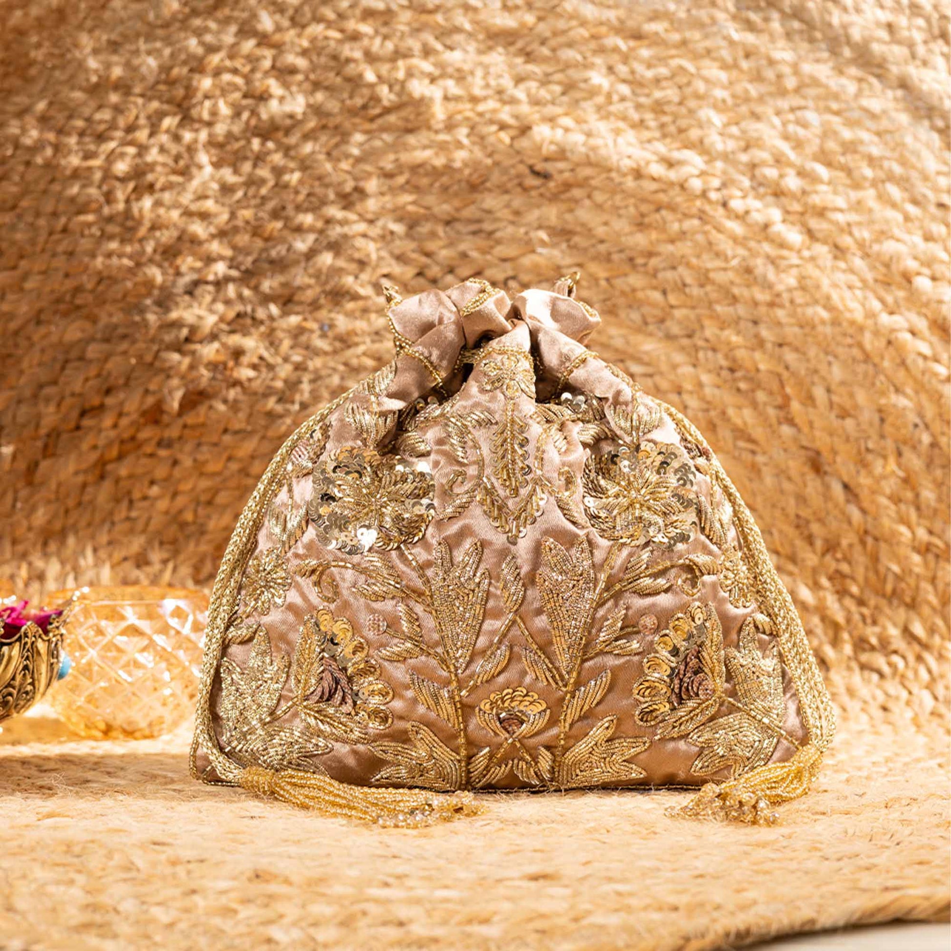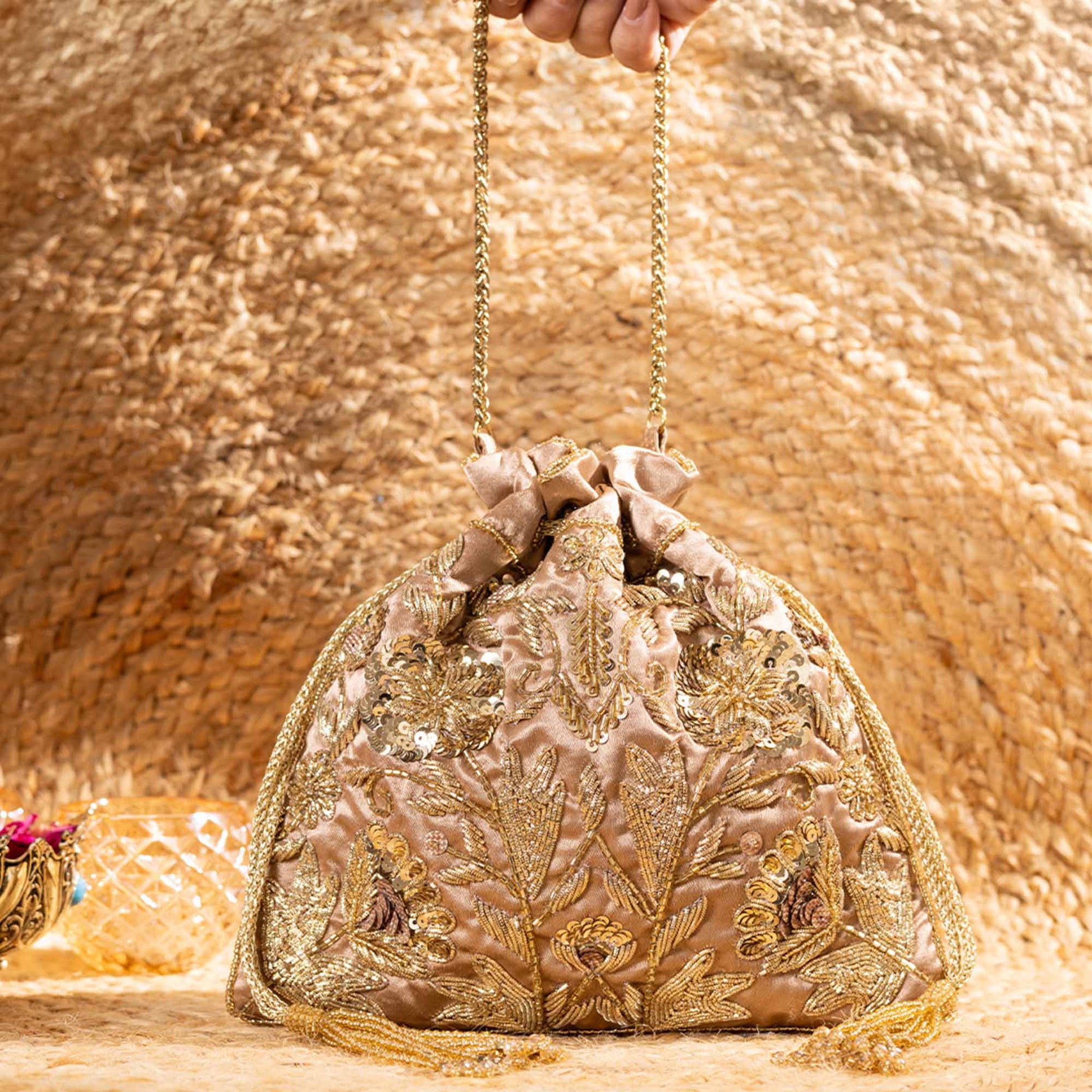Redefine festive elegance with SAANISH potlis, crafted for the woman who loves to blend tradition with contemporary flair. Our designs showcase intricate craftsmanship, luxe textures, and signature embellishments that instantly elevate your look. Lightweight yet spacious, these potlis balance functionality with glamour, making them your perfect companion for weddings, soirées, and everything in between.