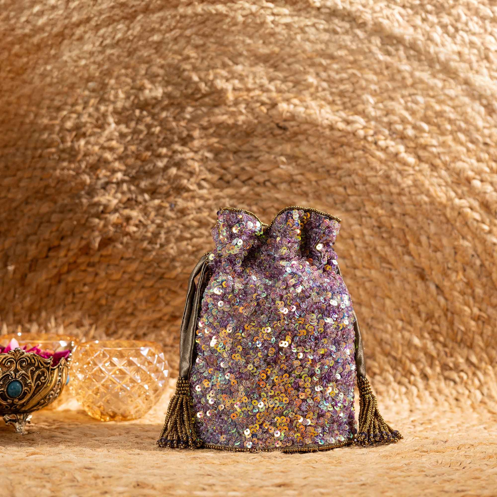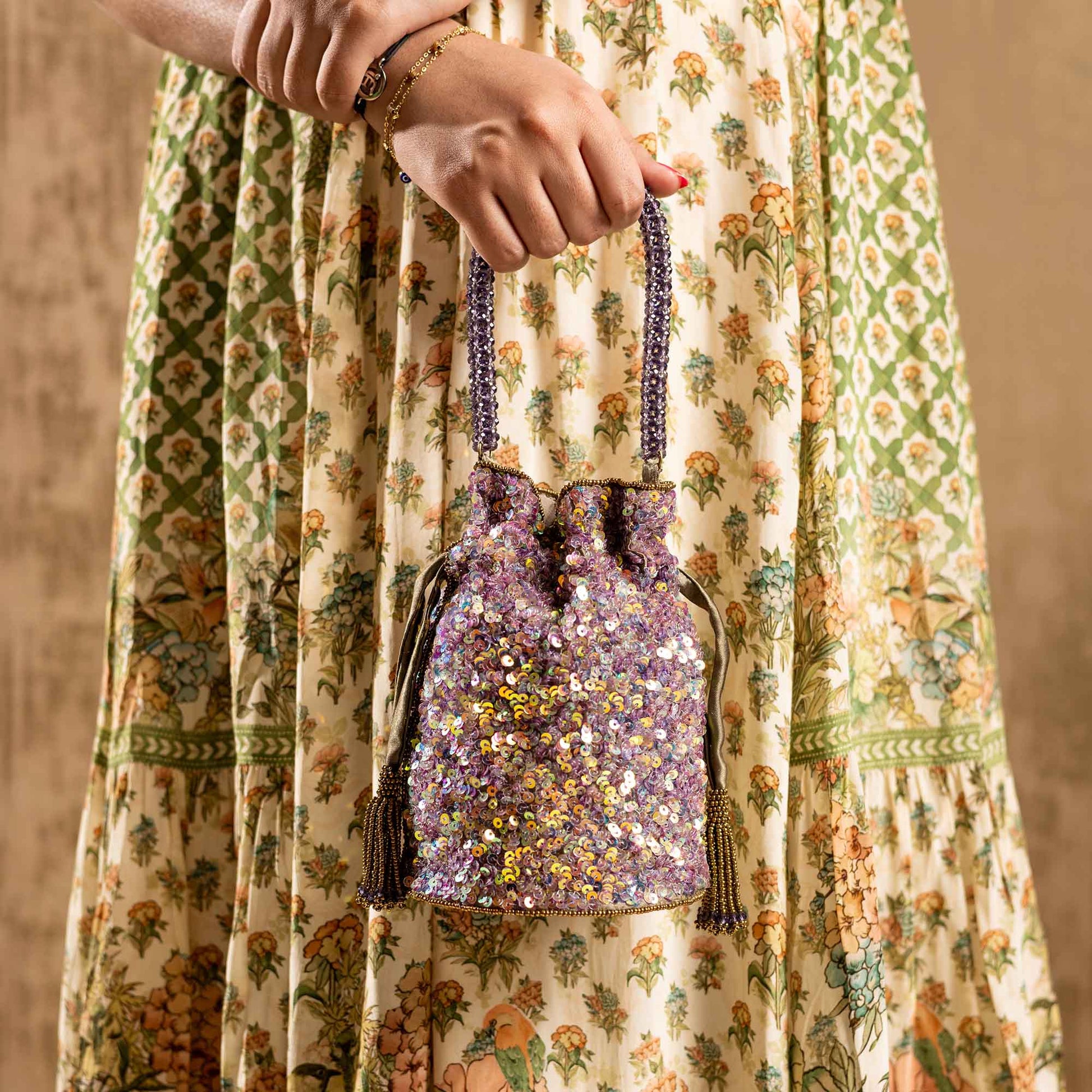 Elevate your festive style with SAANISH bucket potlis — where modern design meets timeless tradition. With their structured silhouette, roomy interiors, and hand-embellished detailing, these potlis strike the perfect balance between statement and sophistication. A must-have for weddings, soirées, and celebrations, they let you carry your essentials with grace and glamour.