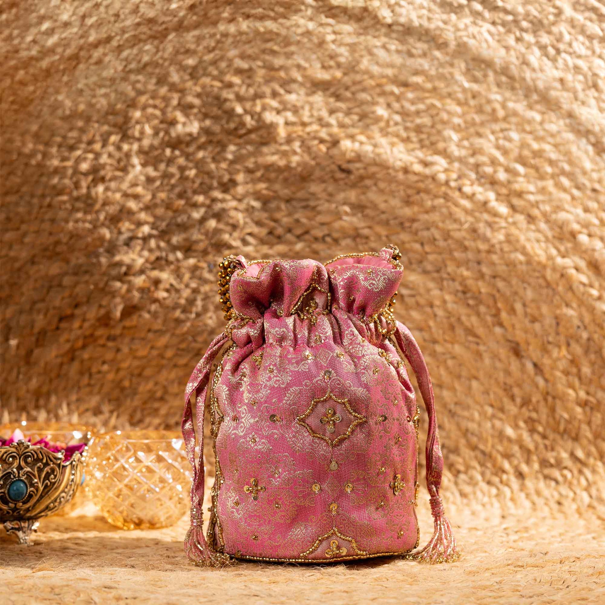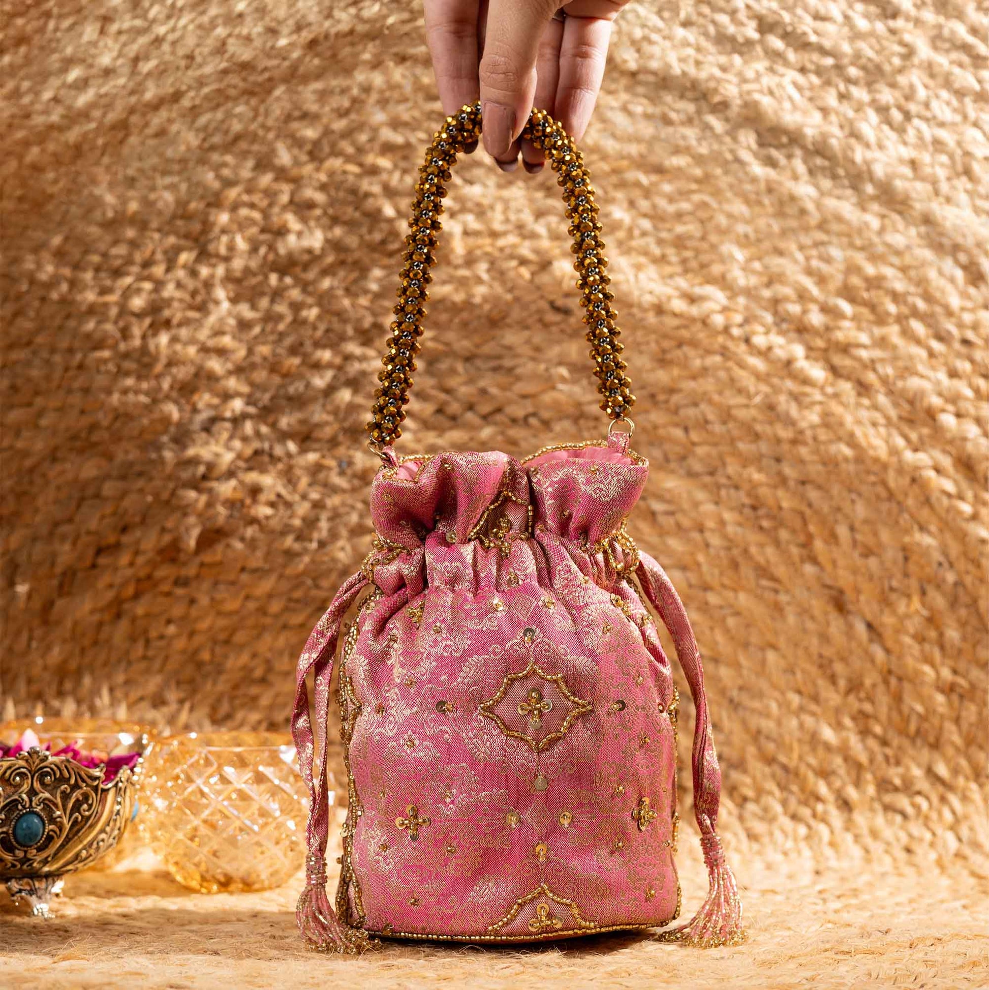 Elevate your festive style with SAANISH bucket potlis — where modern design meets timeless tradition. With their structured silhouette, roomy interiors, and hand-embellished detailing, these potlis strike the perfect balance between statement and sophistication. A must-have for weddings, soirées, and celebrations, they let you carry your essentials with grace and glamour.
