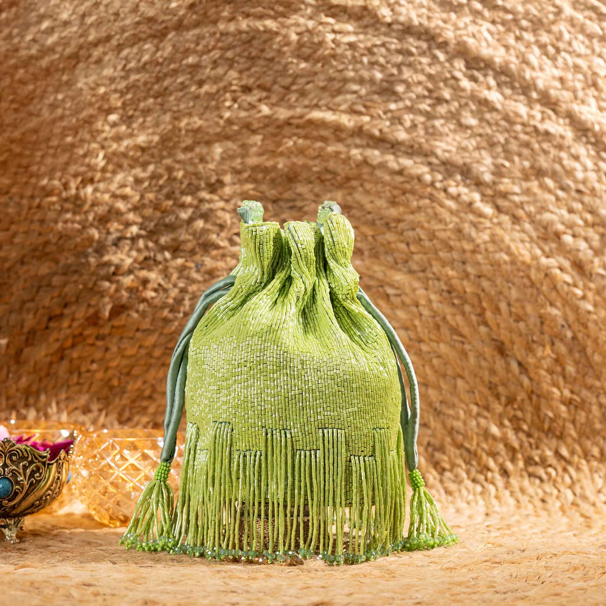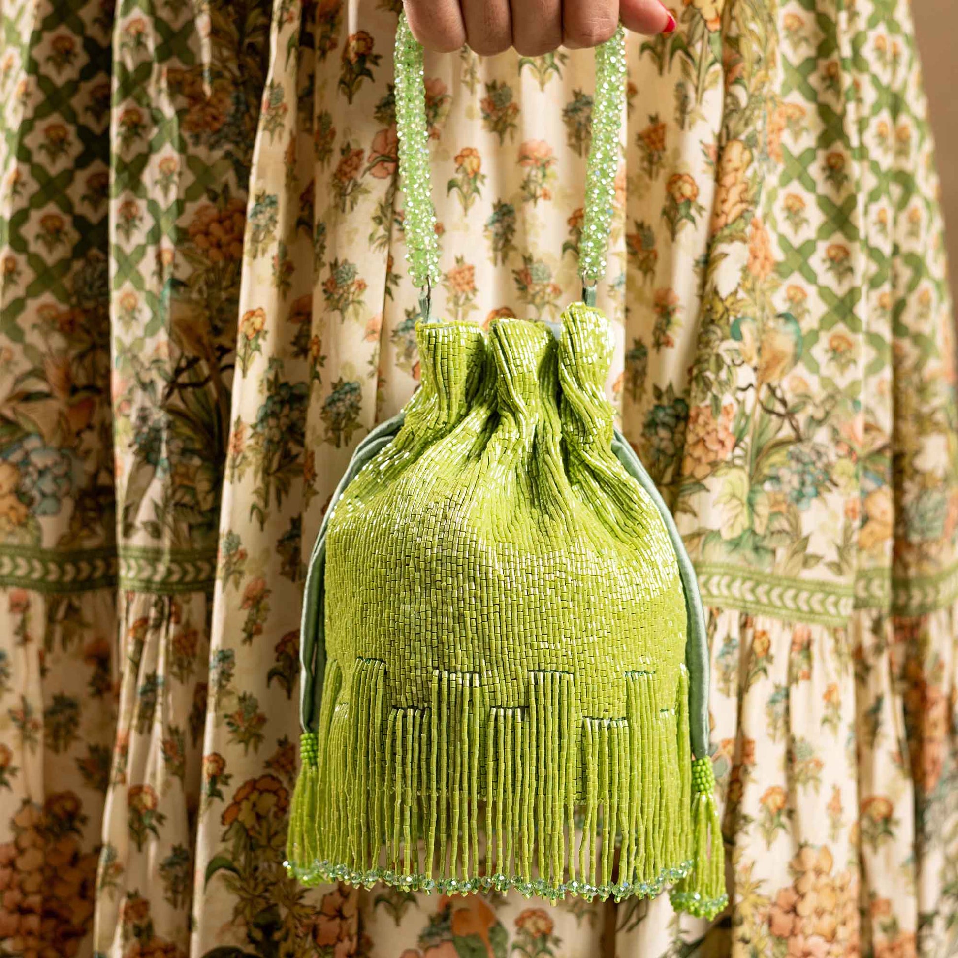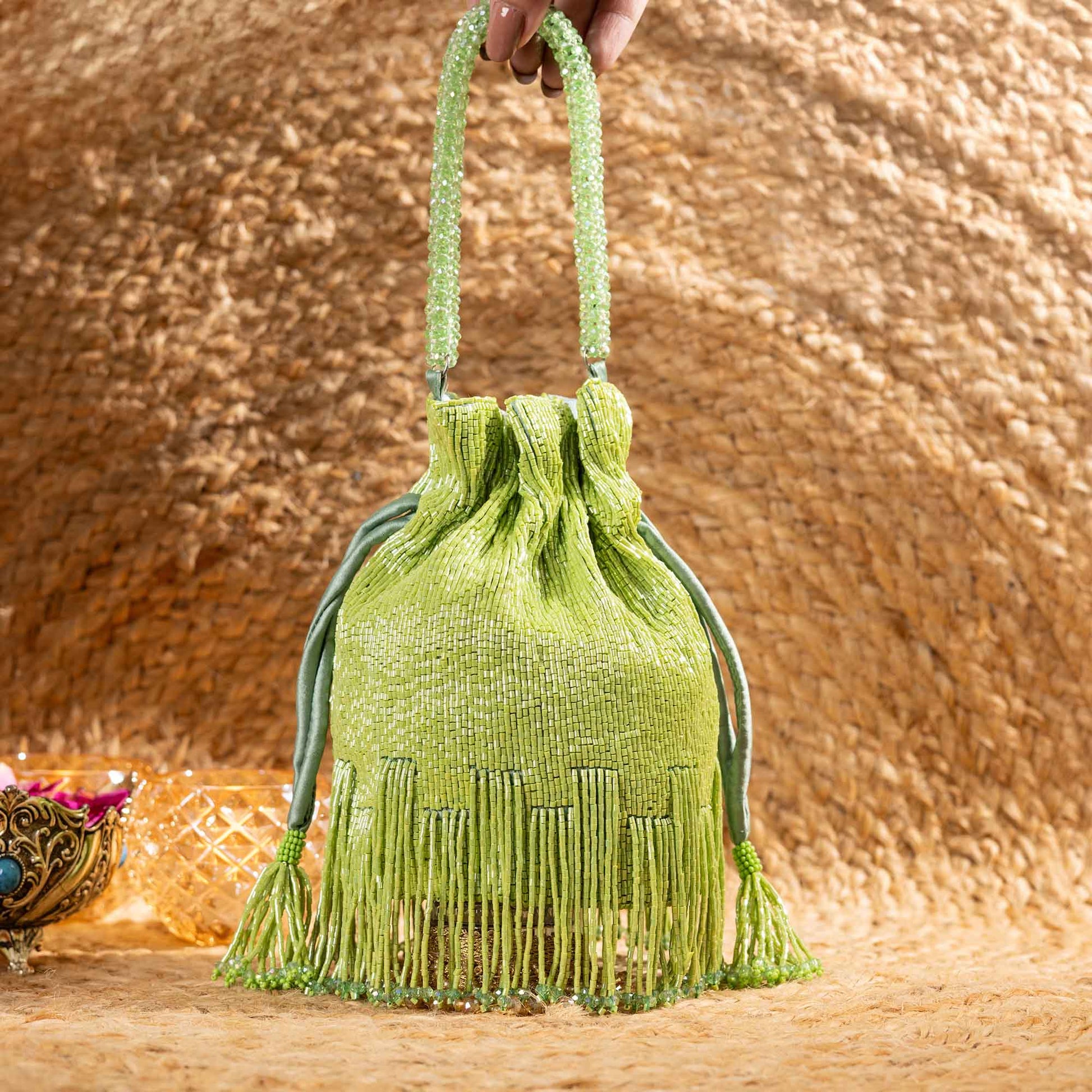 Elevate your festive style with SAANISH bucket potlis — where modern design meets timeless tradition. With their structured silhouette, roomy interiors, and hand-embellished detailing, these potlis strike the perfect balance between statement and sophistication. A must-have for weddings, soirées, and celebrations, they let you carry your essentials with grace and glamour.