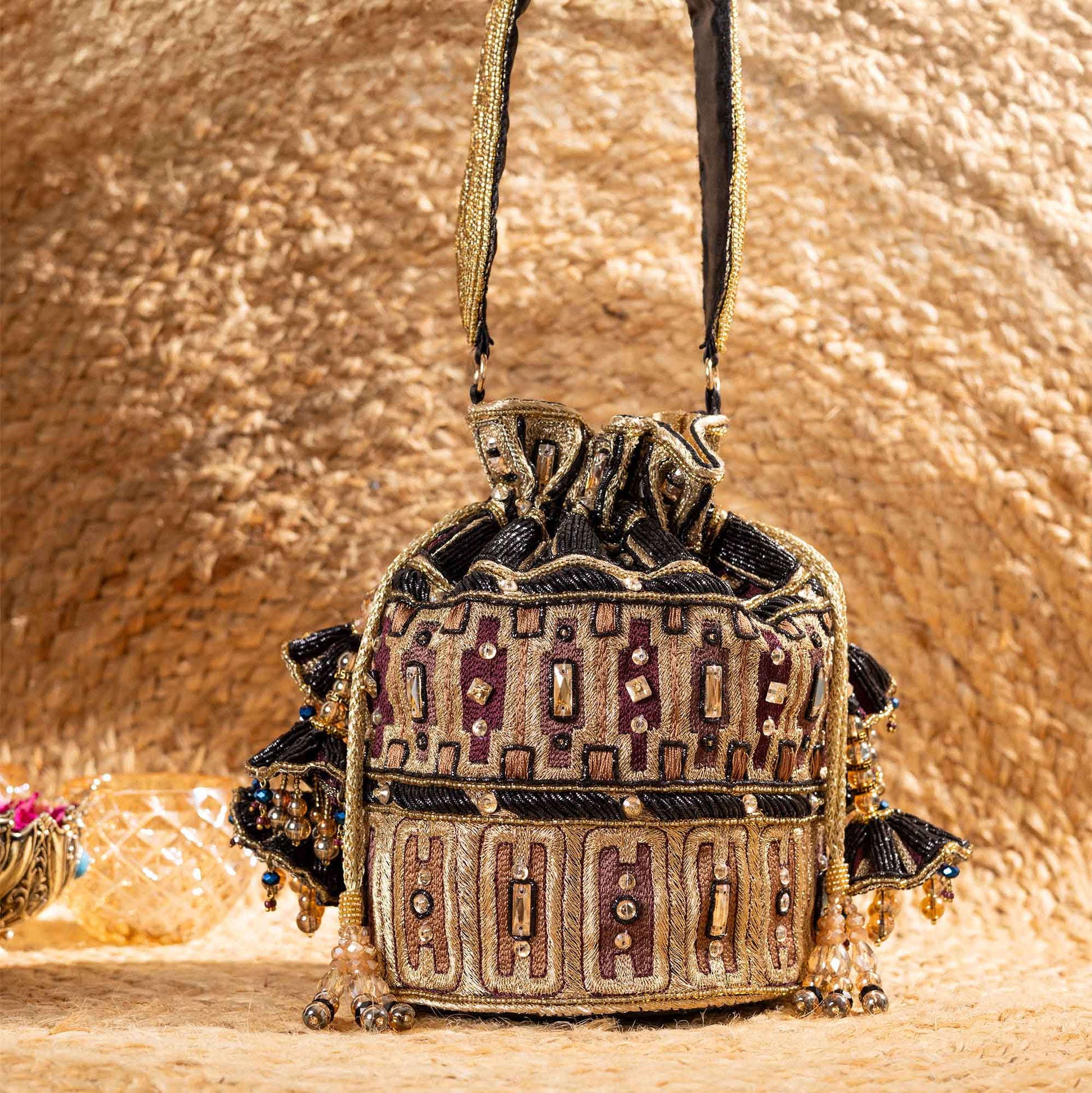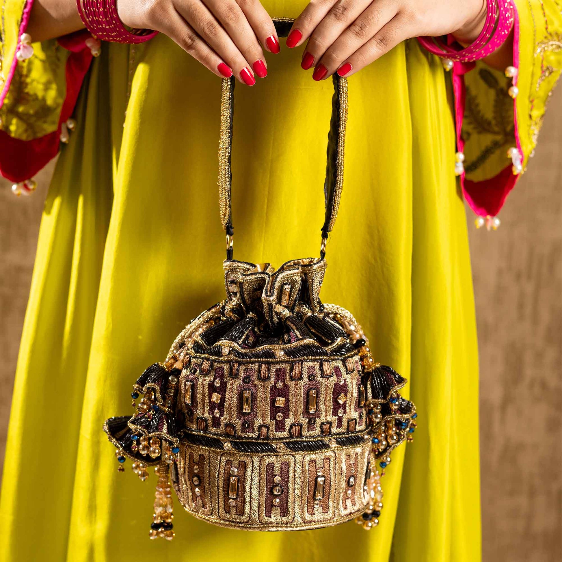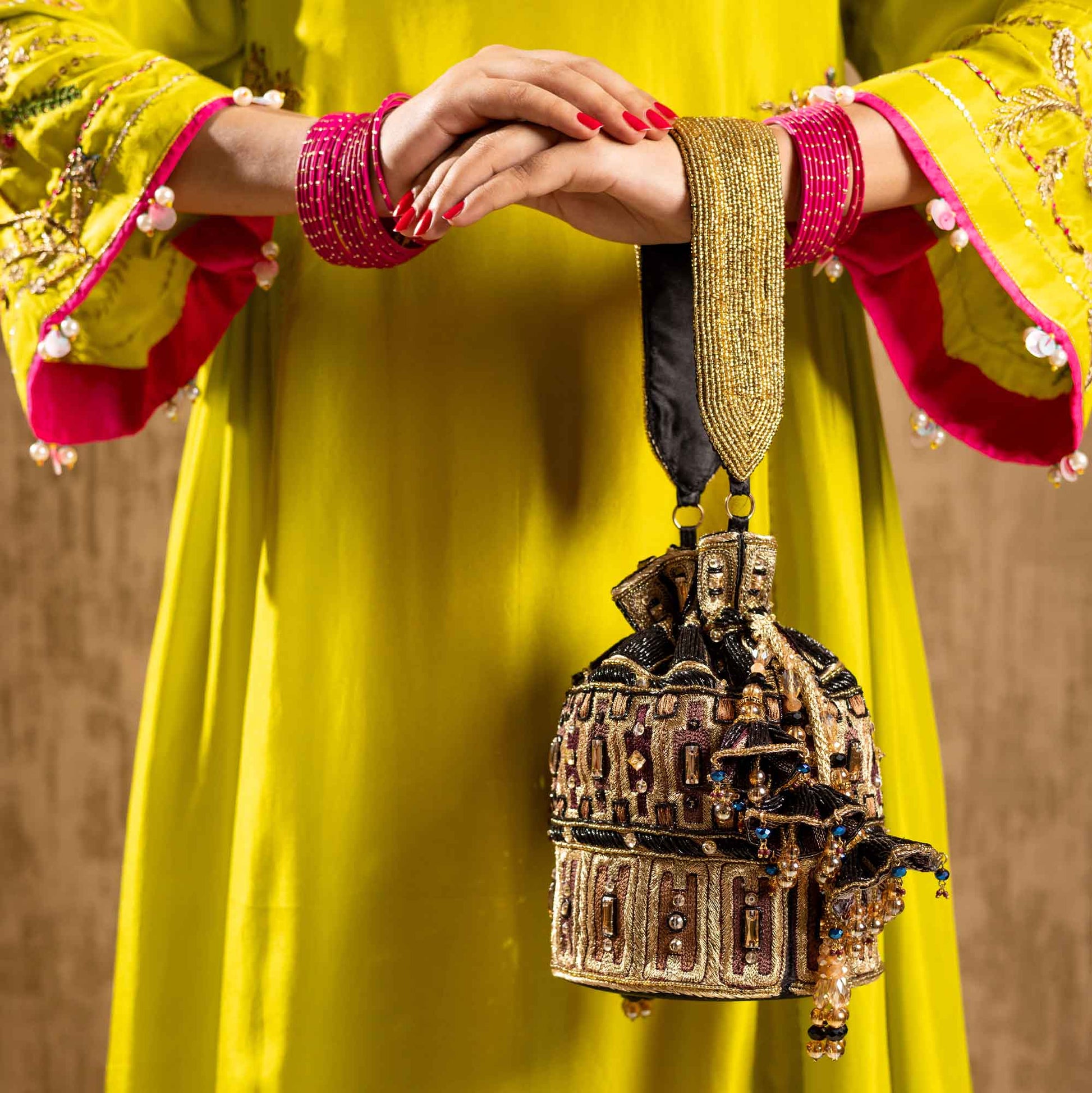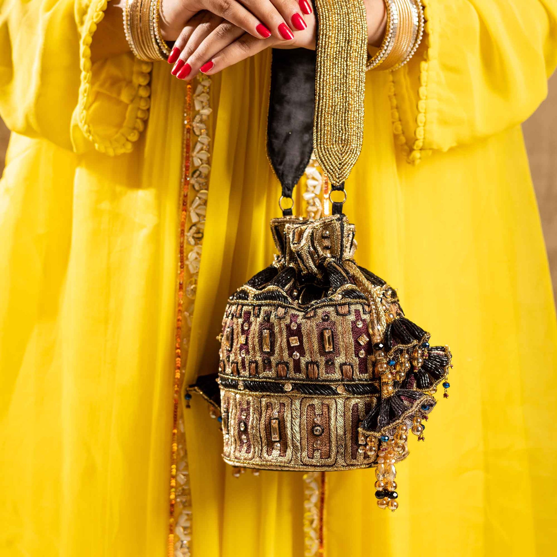 Elevate your festive style with SAANISH bucket potlis — where modern design meets timeless tradition. With their structured silhouette, roomy interiors, and hand-embellished detailing, these potlis strike the perfect balance between statement and sophistication. A must-have for weddings, soirées, and celebrations, they let you carry your essentials with grace and glamour.