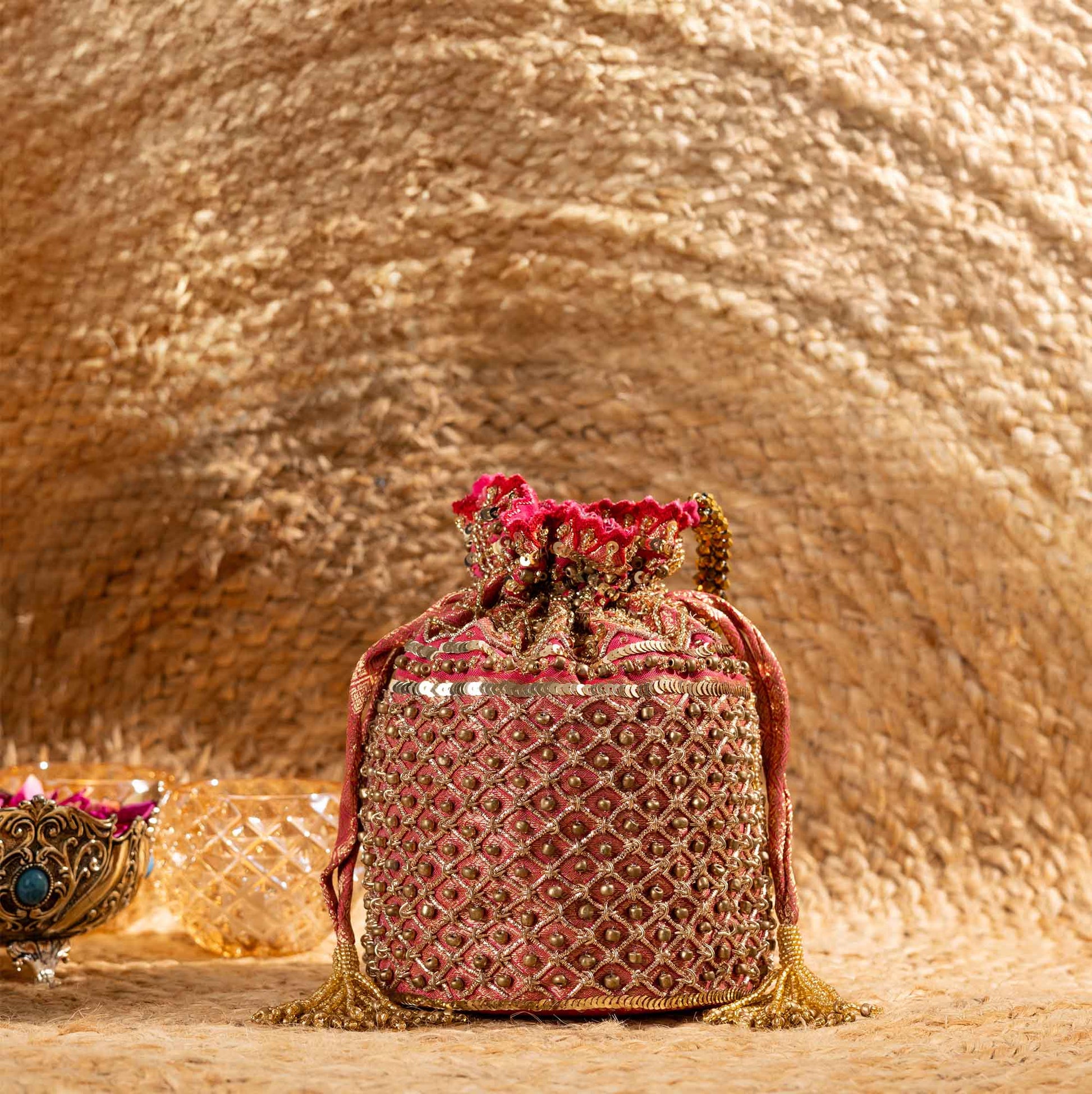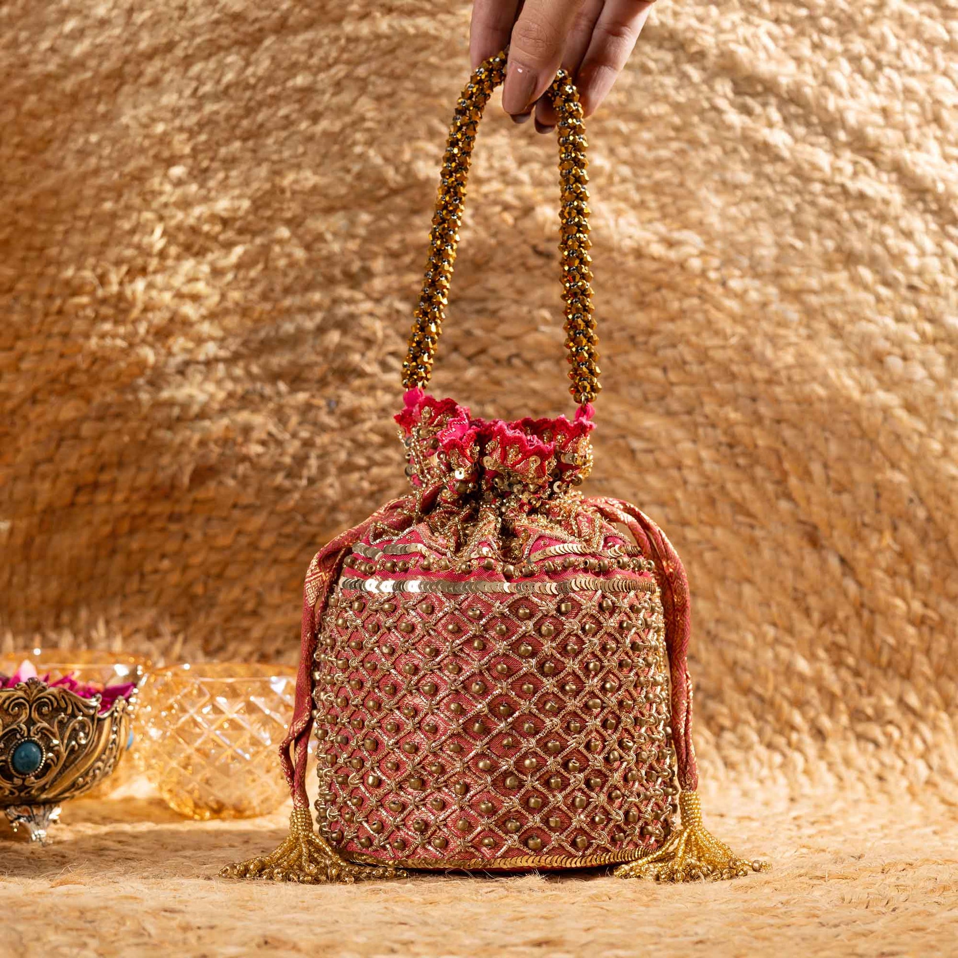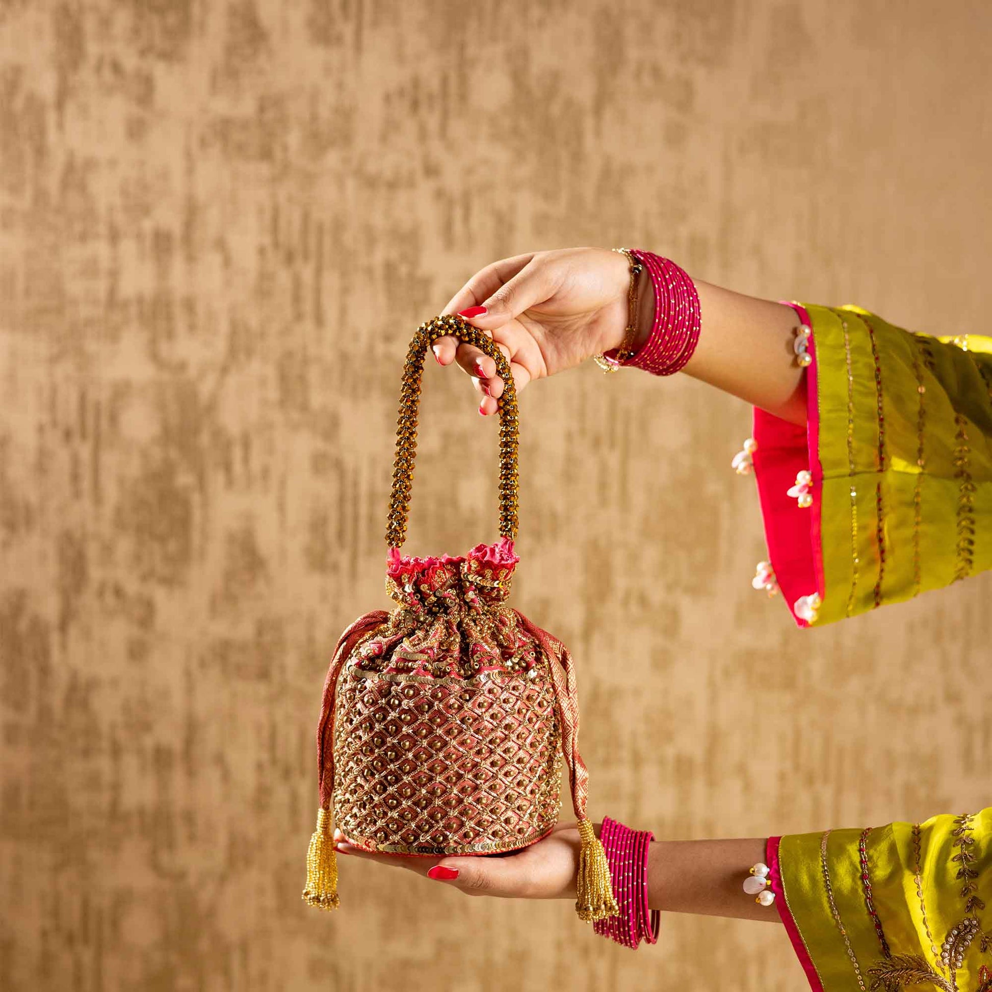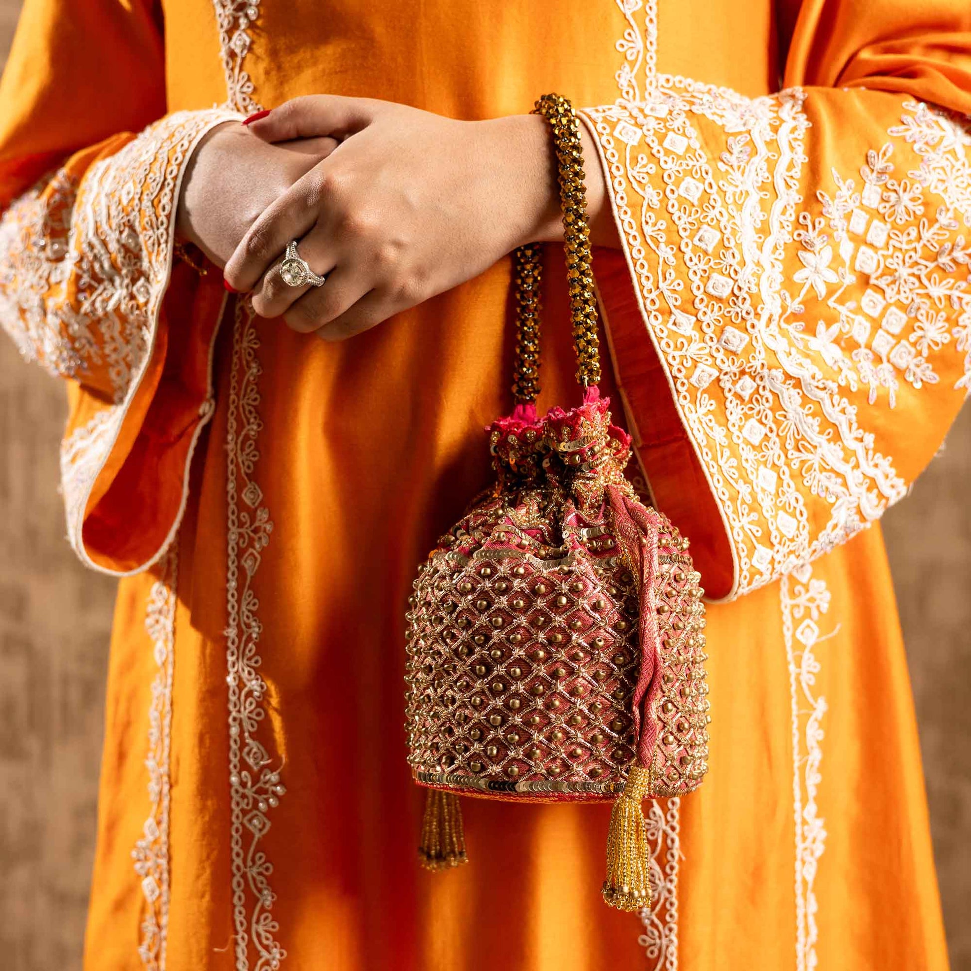 Elevate your festive style with SAANISH bucket potlis — where modern design meets timeless tradition. With their structured silhouette, roomy interiors, and hand-embellished detailing, these potlis strike the perfect balance between statement and sophistication. A must-have for weddings, soirées, and celebrations, they let you carry your essentials with grace and glamour.