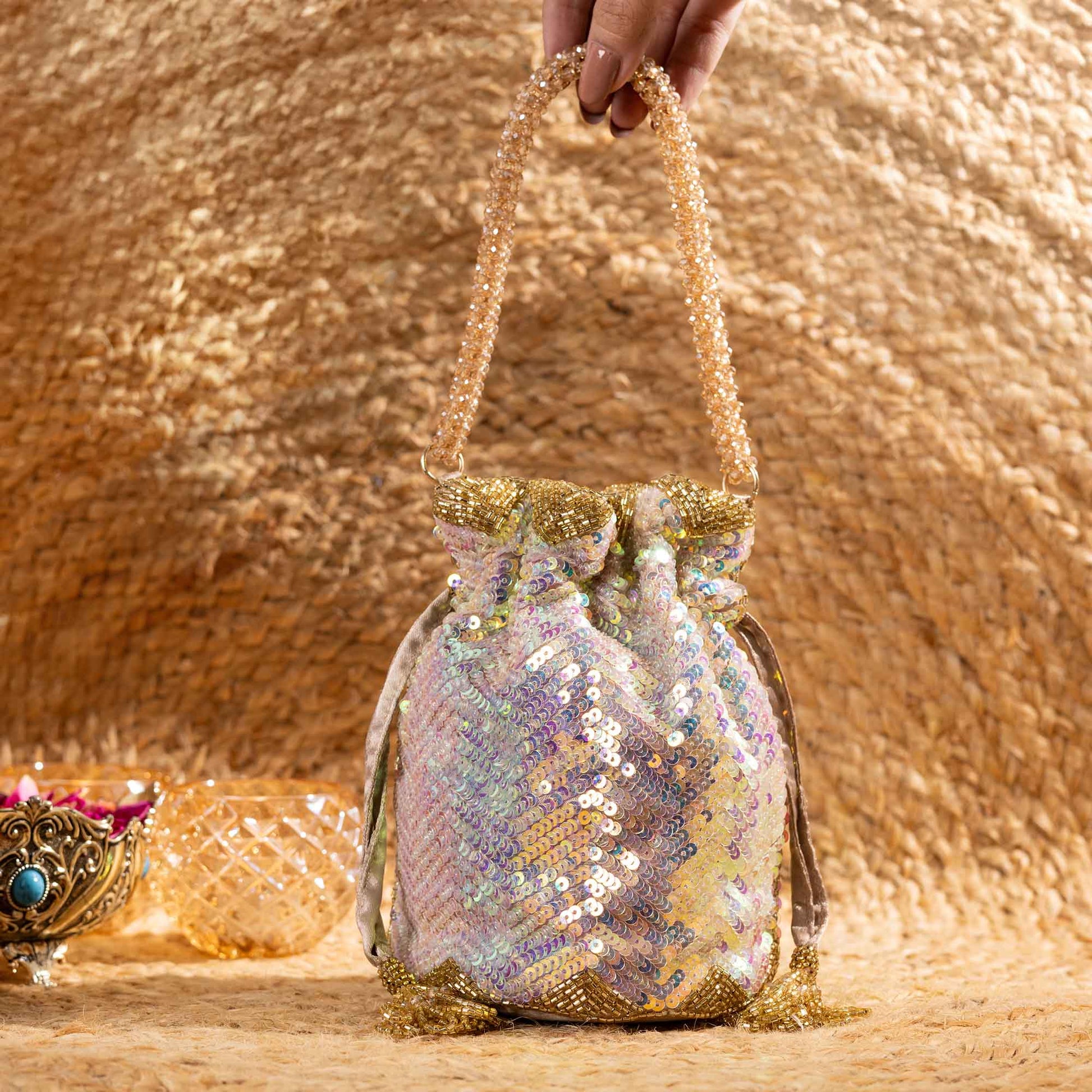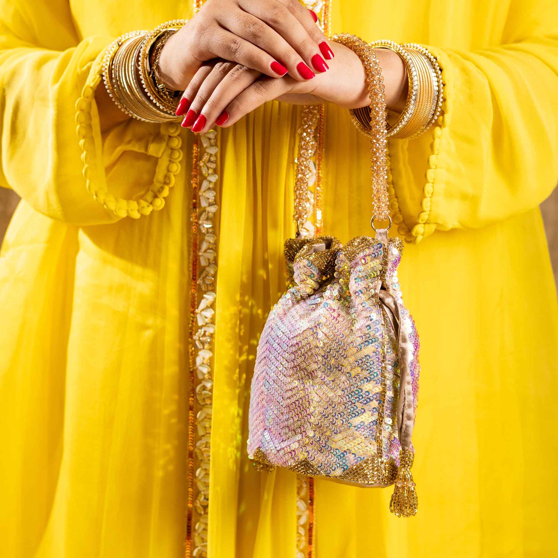 Elevate your festive style with SAANISH bucket potlis — where modern design meets timeless tradition. With their structured silhouette, roomy interiors, and hand-embellished detailing, these potlis strike the perfect balance between statement and sophistication. A must-have for weddings, soirées, and celebrations, they let you carry your essentials with grace and glamour.