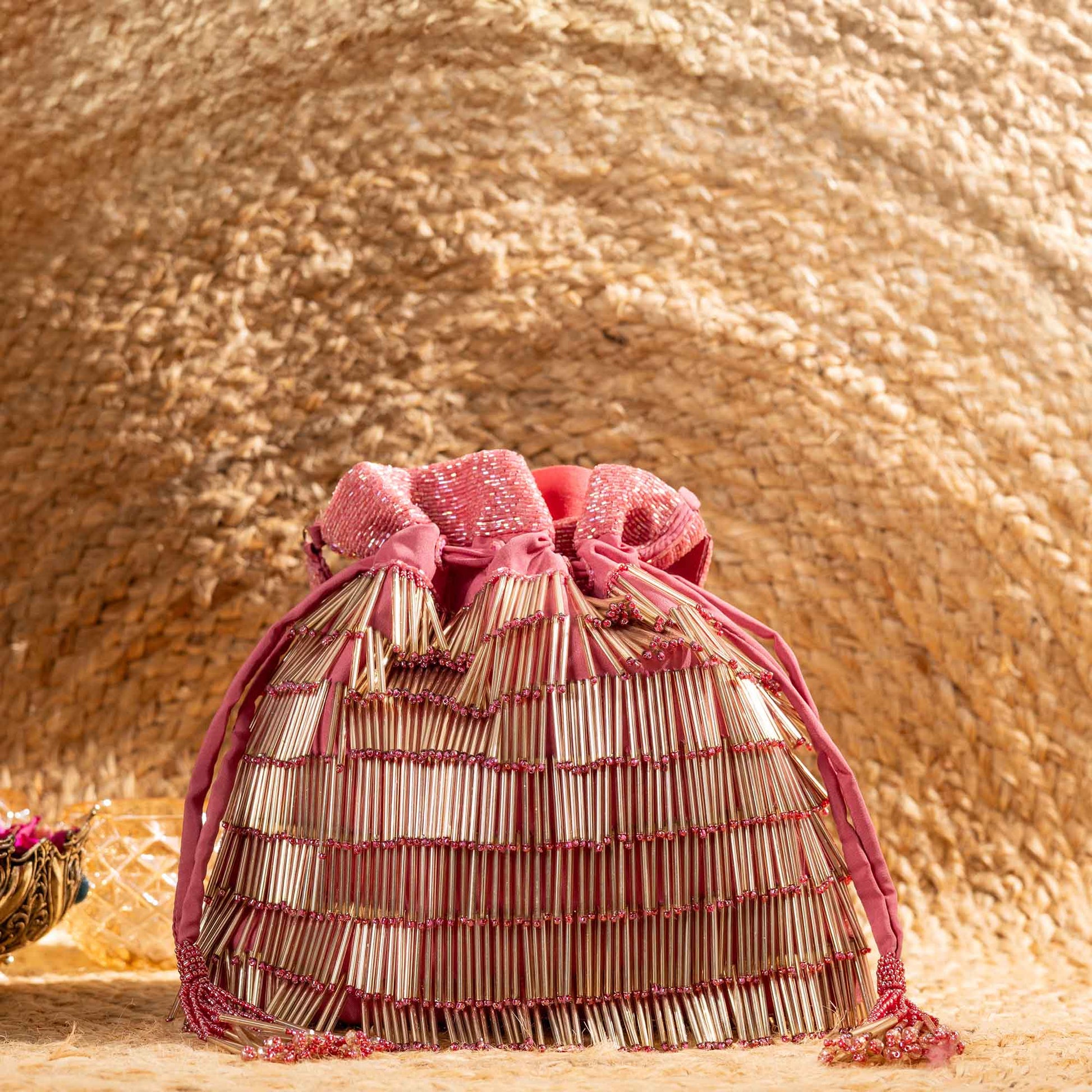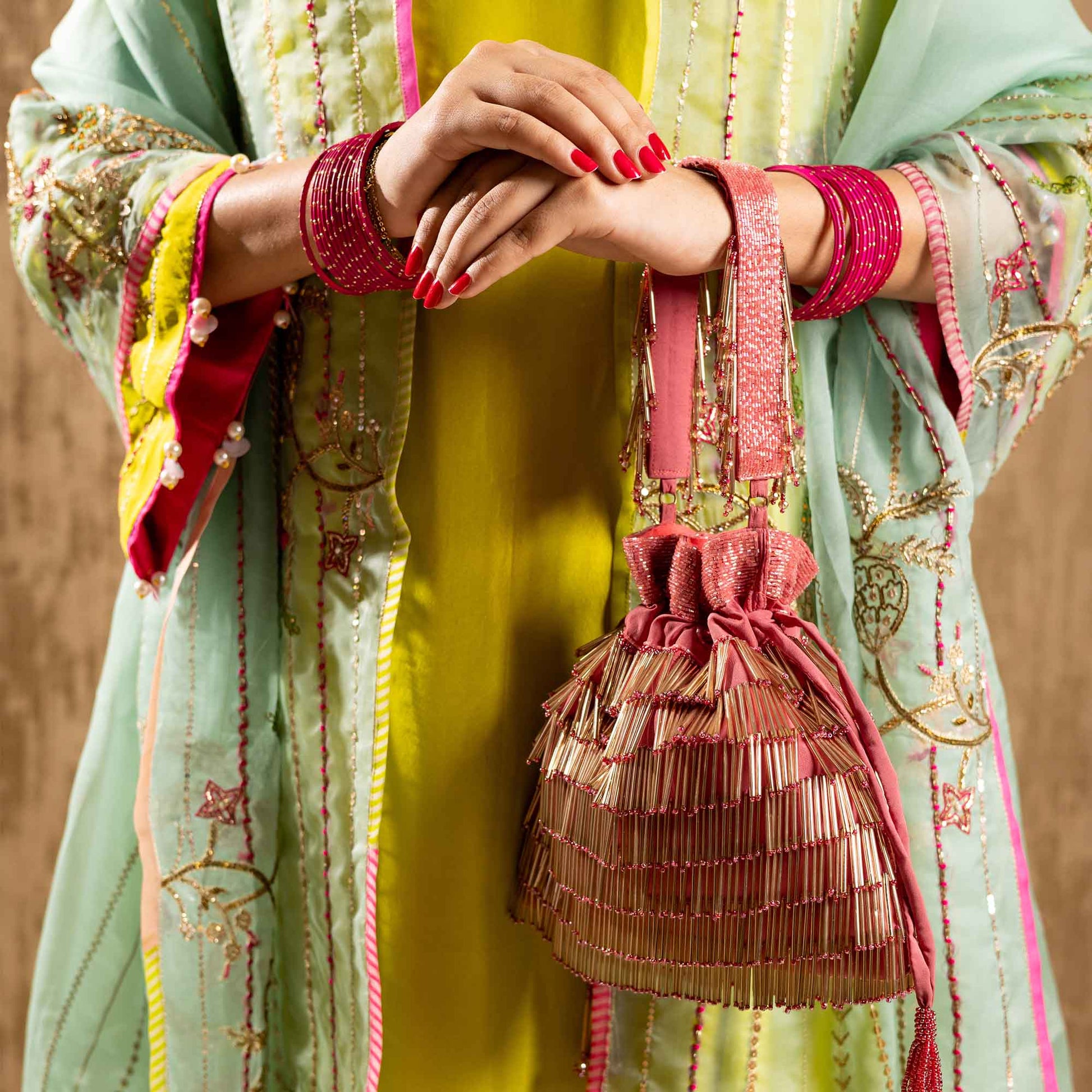 Redefine festive elegance with SAANISH potlis, crafted for the woman who loves to blend tradition with contemporary flair. Our designs showcase intricate craftsmanship, luxe textures, and signature embellishments that instantly elevate your look. Lightweight yet spacious, these potlis balance functionality with glamour, making them your perfect companion for weddings, soirées, and everything in between.