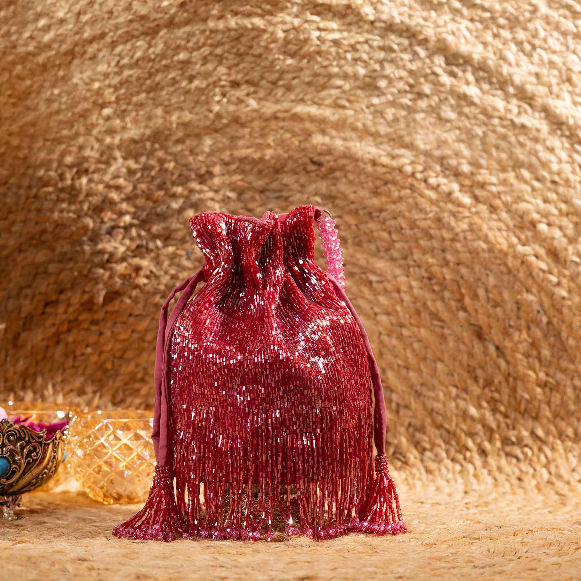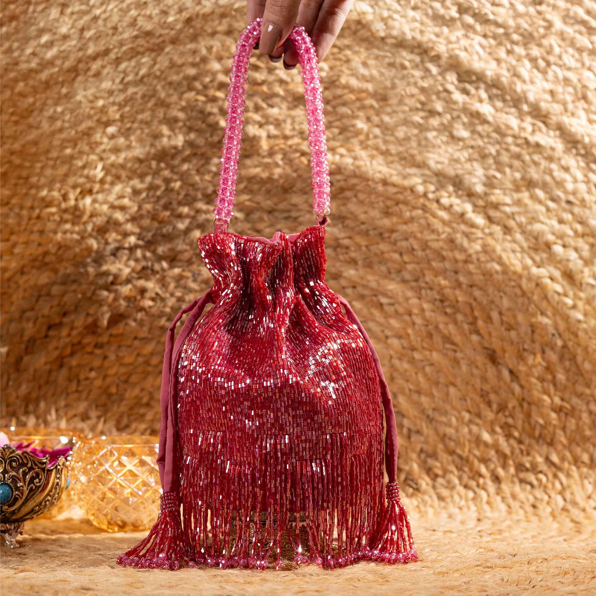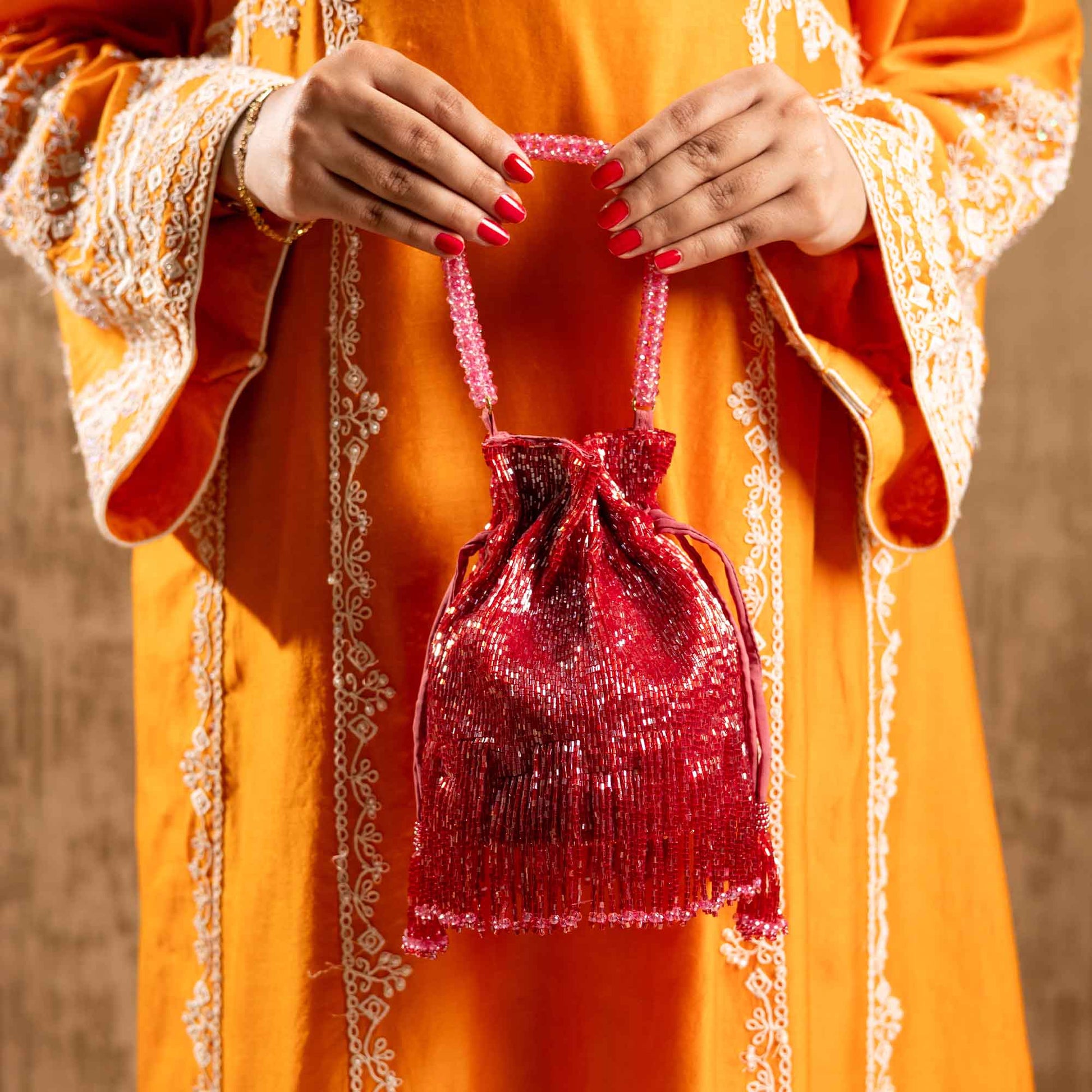 Elevate your festive style with SAANISH bucket potlis — where modern design meets timeless tradition. With their structured silhouette, roomy interiors, and hand-embellished detailing, these potlis strike the perfect balance between statement and sophistication. A must-have for weddings, soirées, and celebrations, they let you carry your essentials with grace and glamour.