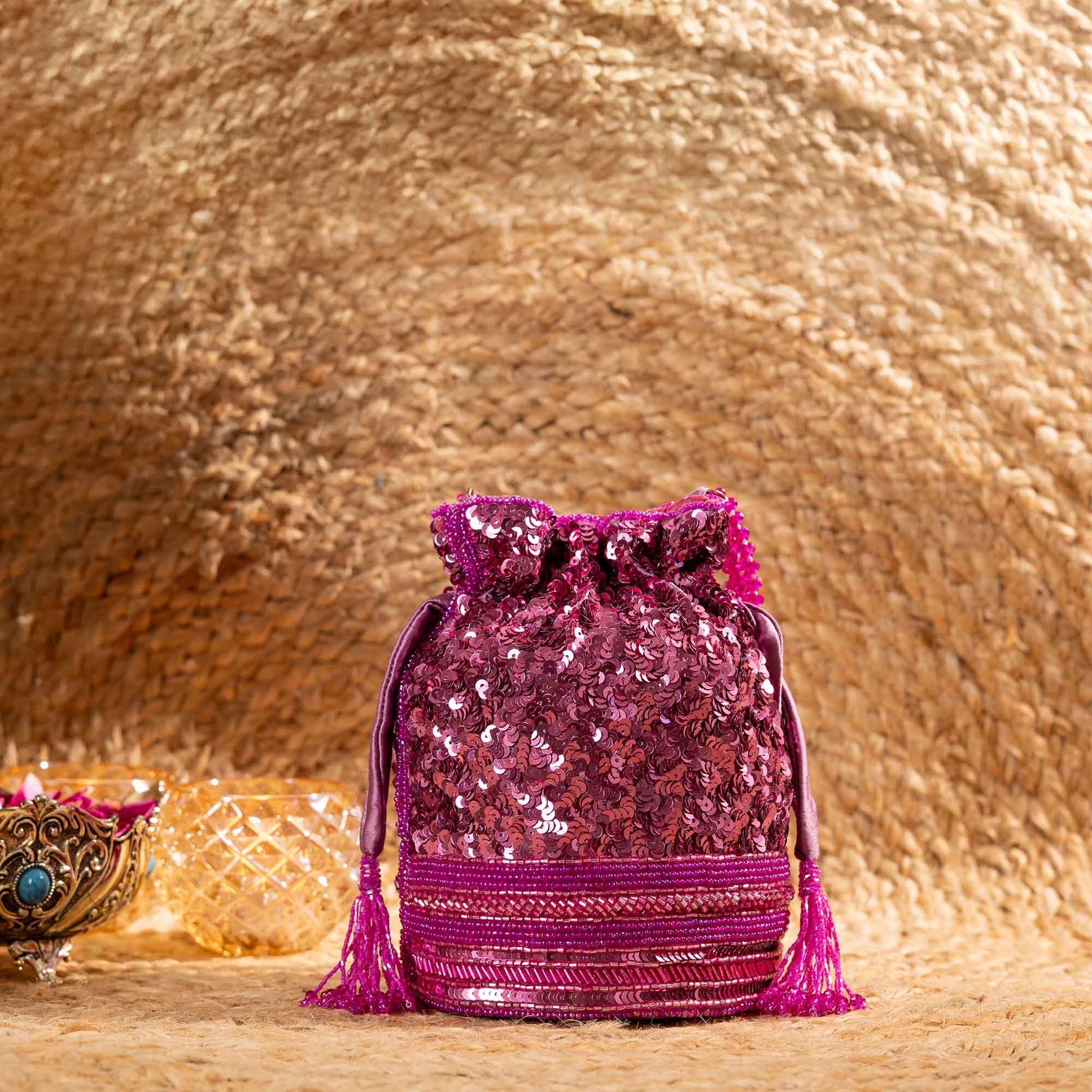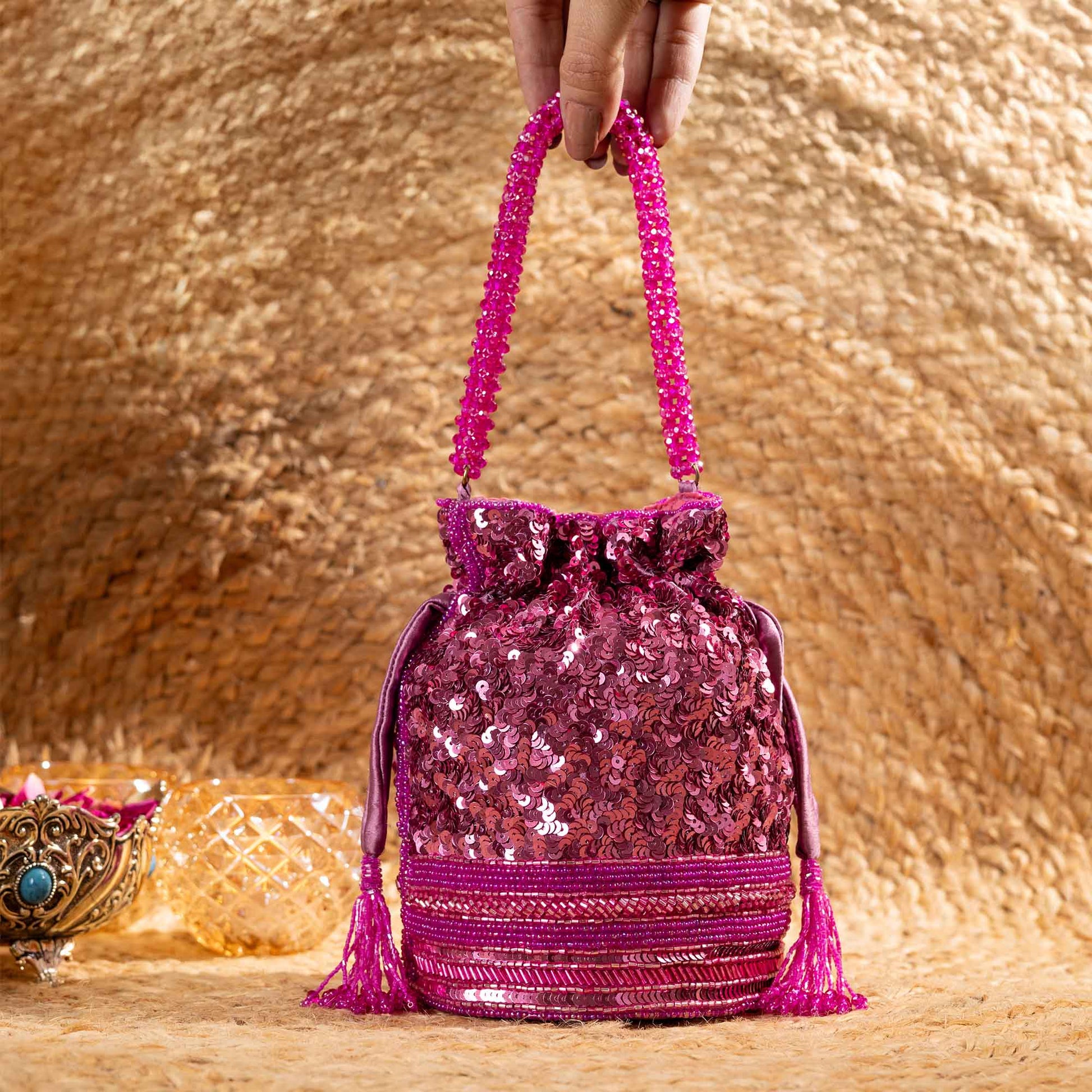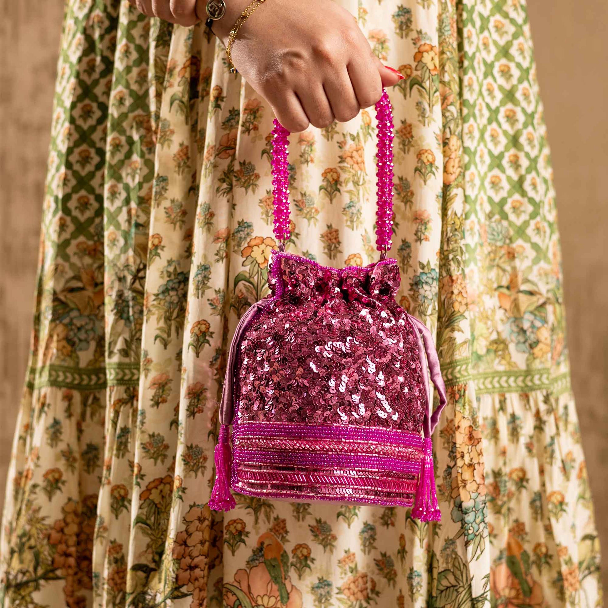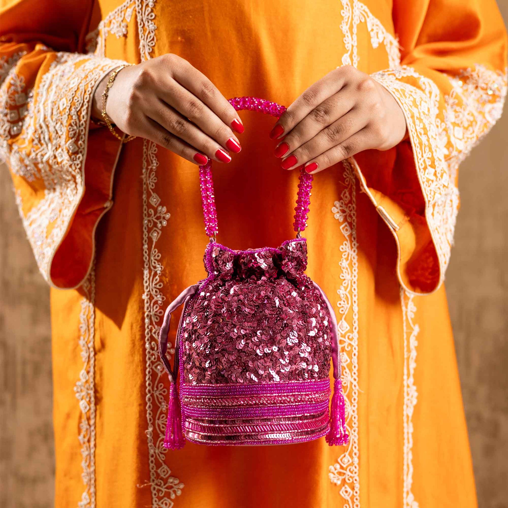 Elevate your festive style with SAANISH bucket potlis — where modern design meets timeless tradition. With their structured silhouette, roomy interiors, and hand-embellished detailing, these potlis strike the perfect balance between statement and sophistication. A must-have for weddings, soirées, and celebrations, they let you carry your essentials with grace and glamour.