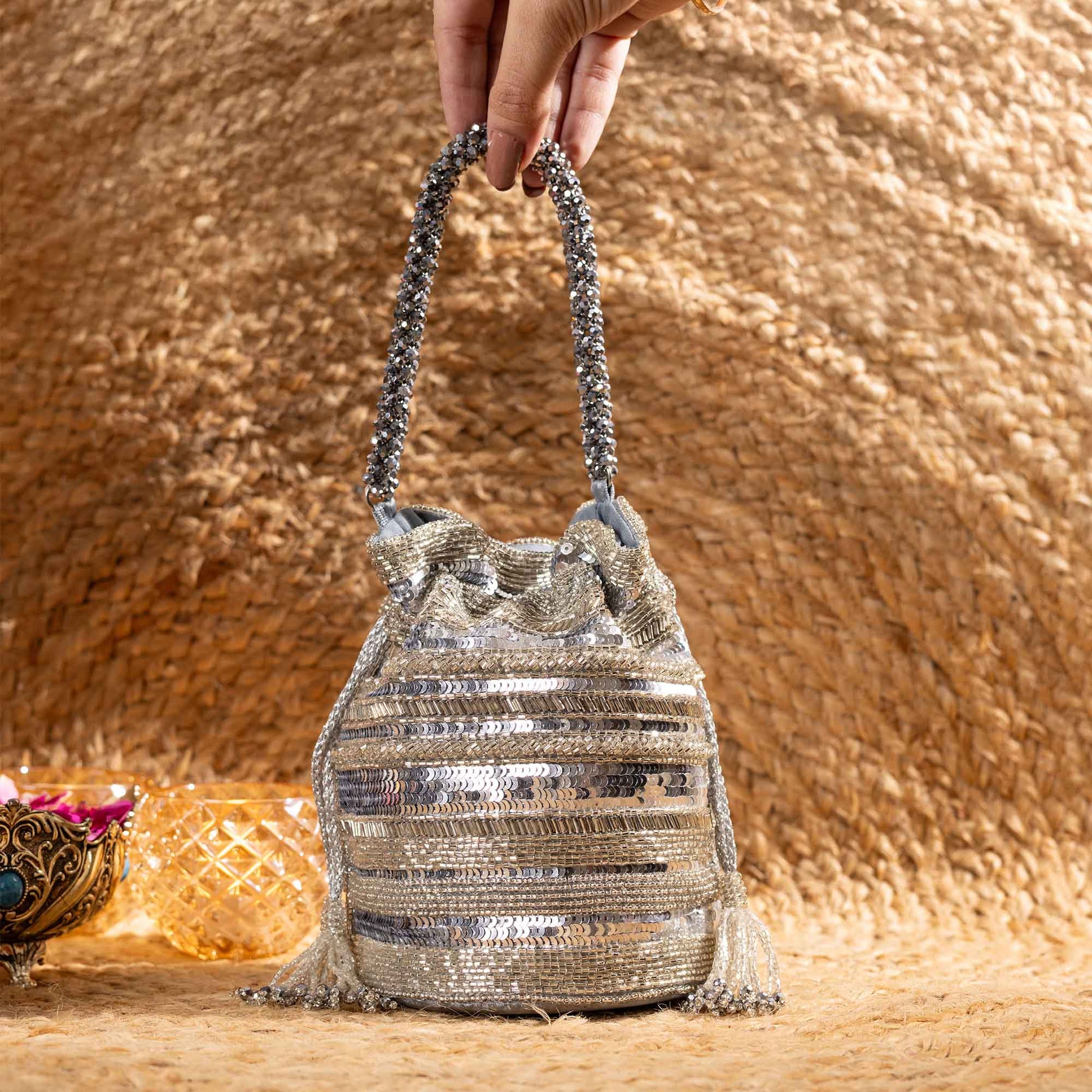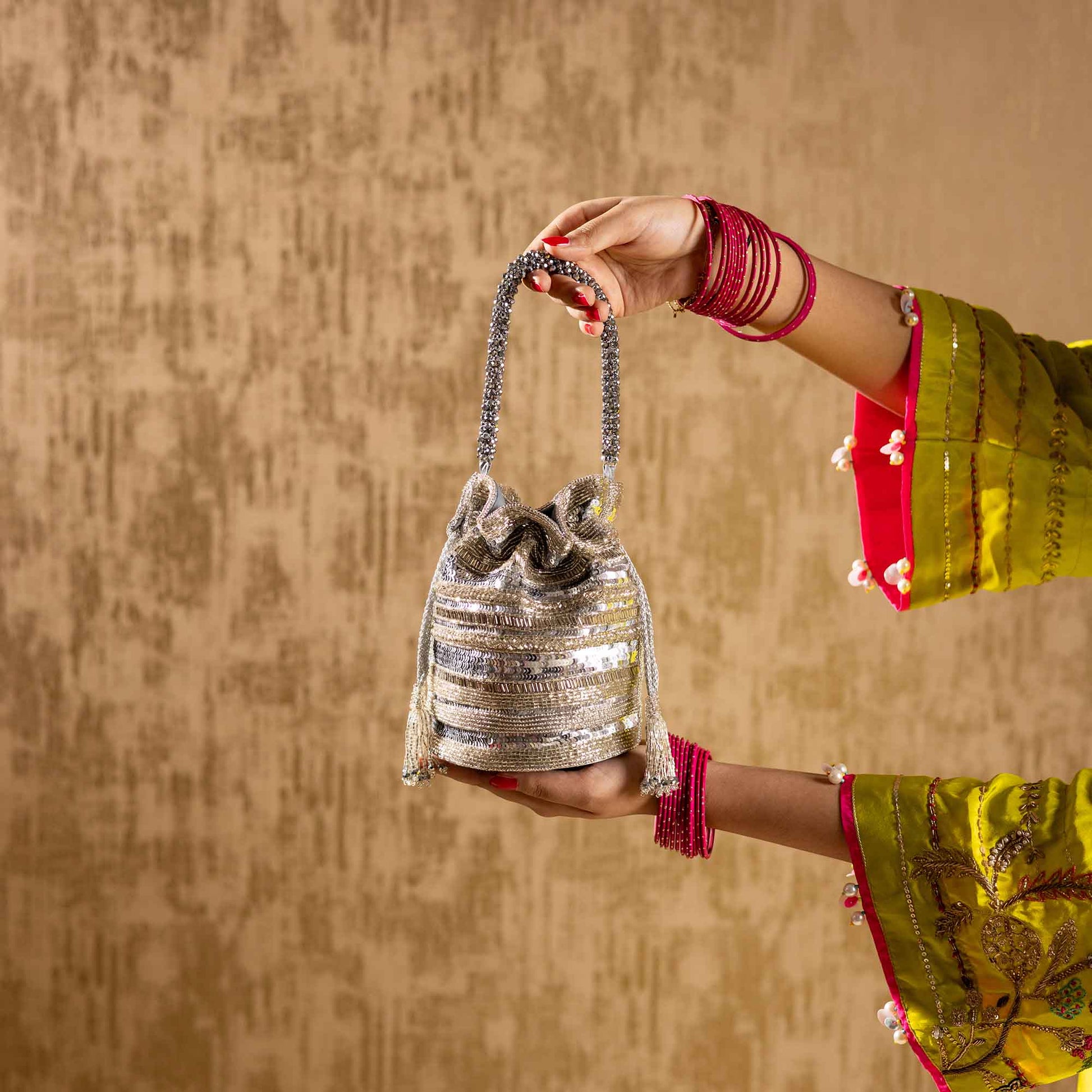 Elevate your festive style with SAANISH bucket potlis — where modern design meets timeless tradition. With their structured silhouette, roomy interiors, and hand-embellished detailing, these potlis strike the perfect balance between statement and sophistication. A must-have for weddings, soirées, and celebrations, they let you carry your essentials with grace and glamour.