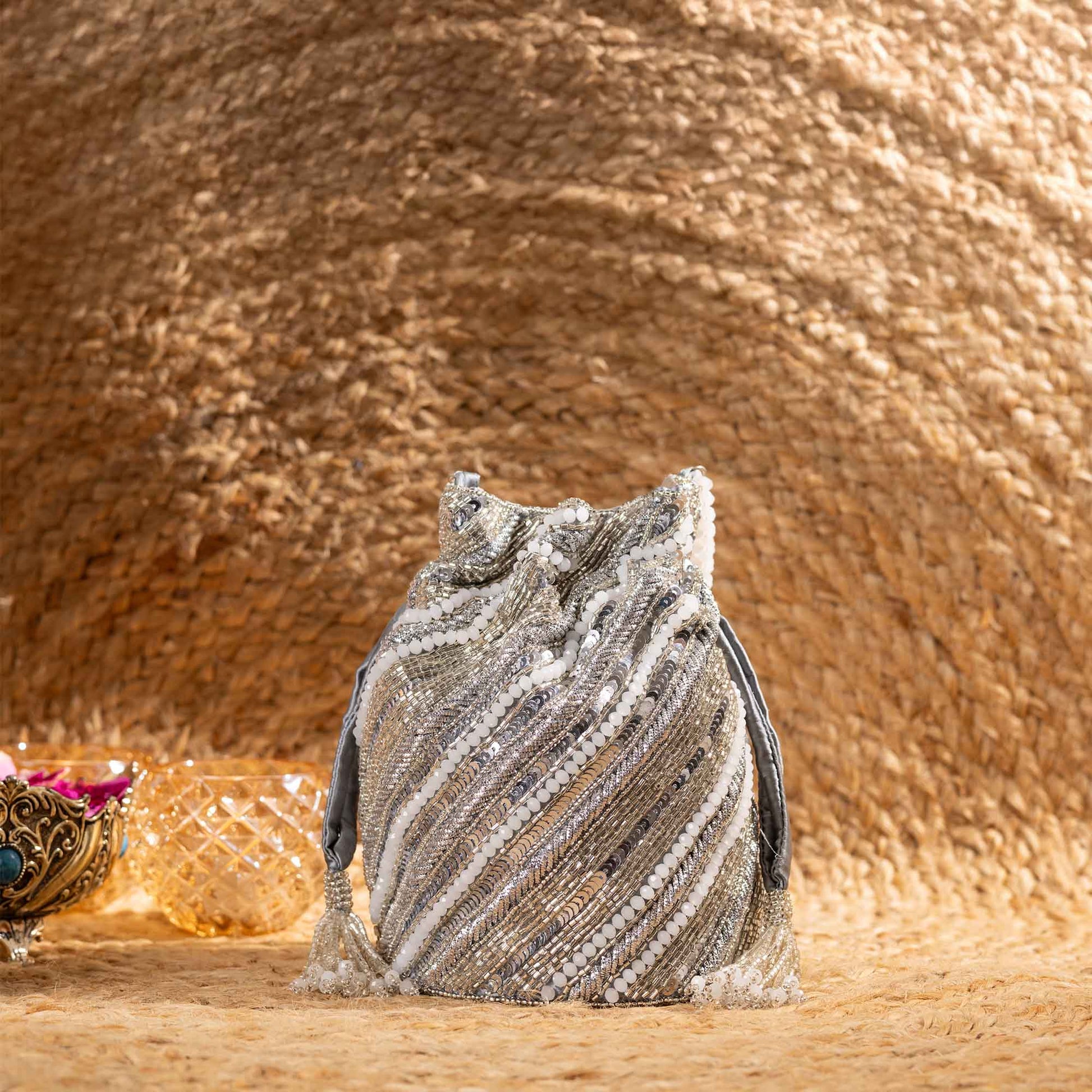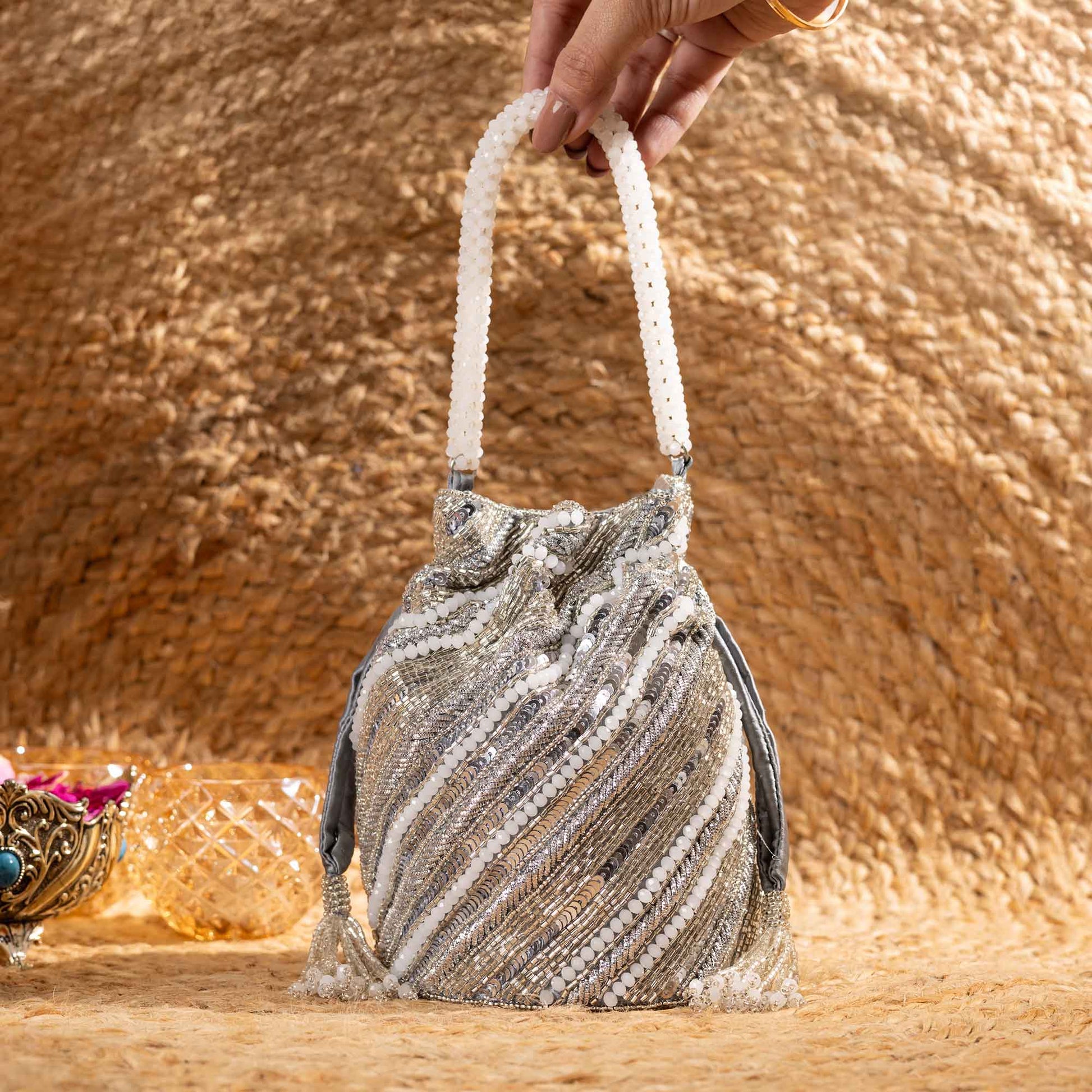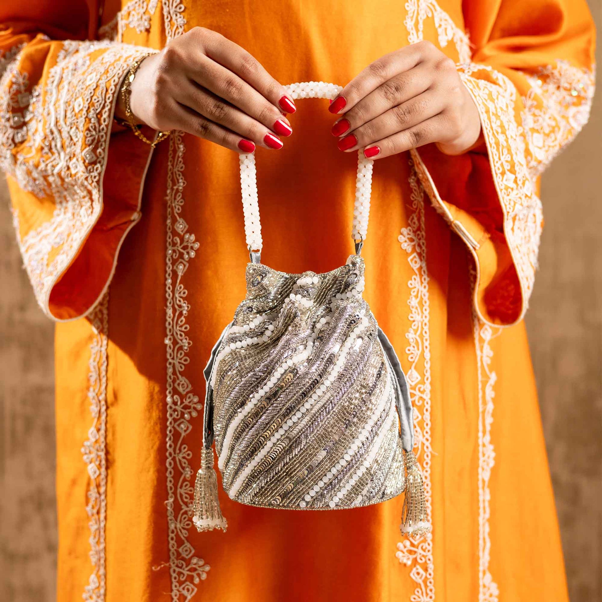 Elevate your festive style with SAANISH bucket potlis — where modern design meets timeless tradition. With their structured silhouette, roomy interiors, and hand-embellished detailing, these potlis strike the perfect balance between statement and sophistication. A must-have for weddings, soirées, and celebrations, they let you carry your essentials with grace and glamour.