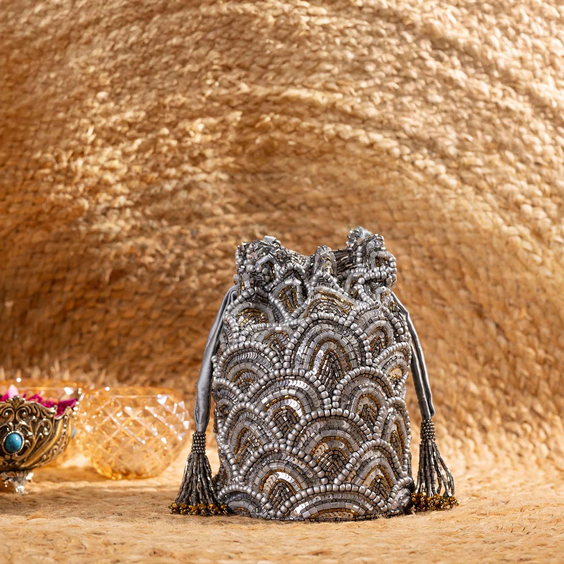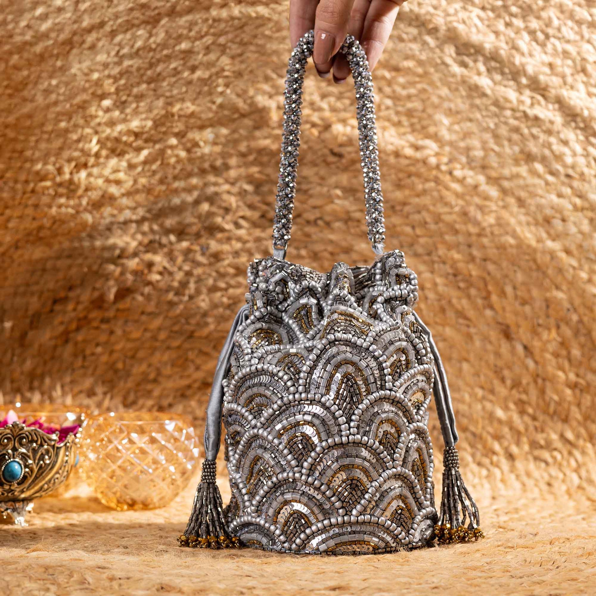 Elevate your festive style with SAANISH bucket potlis — where modern design meets timeless tradition. With their structured silhouette, roomy interiors, and hand-embellished detailing, these potlis strike the perfect balance between statement and sophistication. A must-have for weddings, soirées, and celebrations, they let you carry your essentials with grace and glamour.